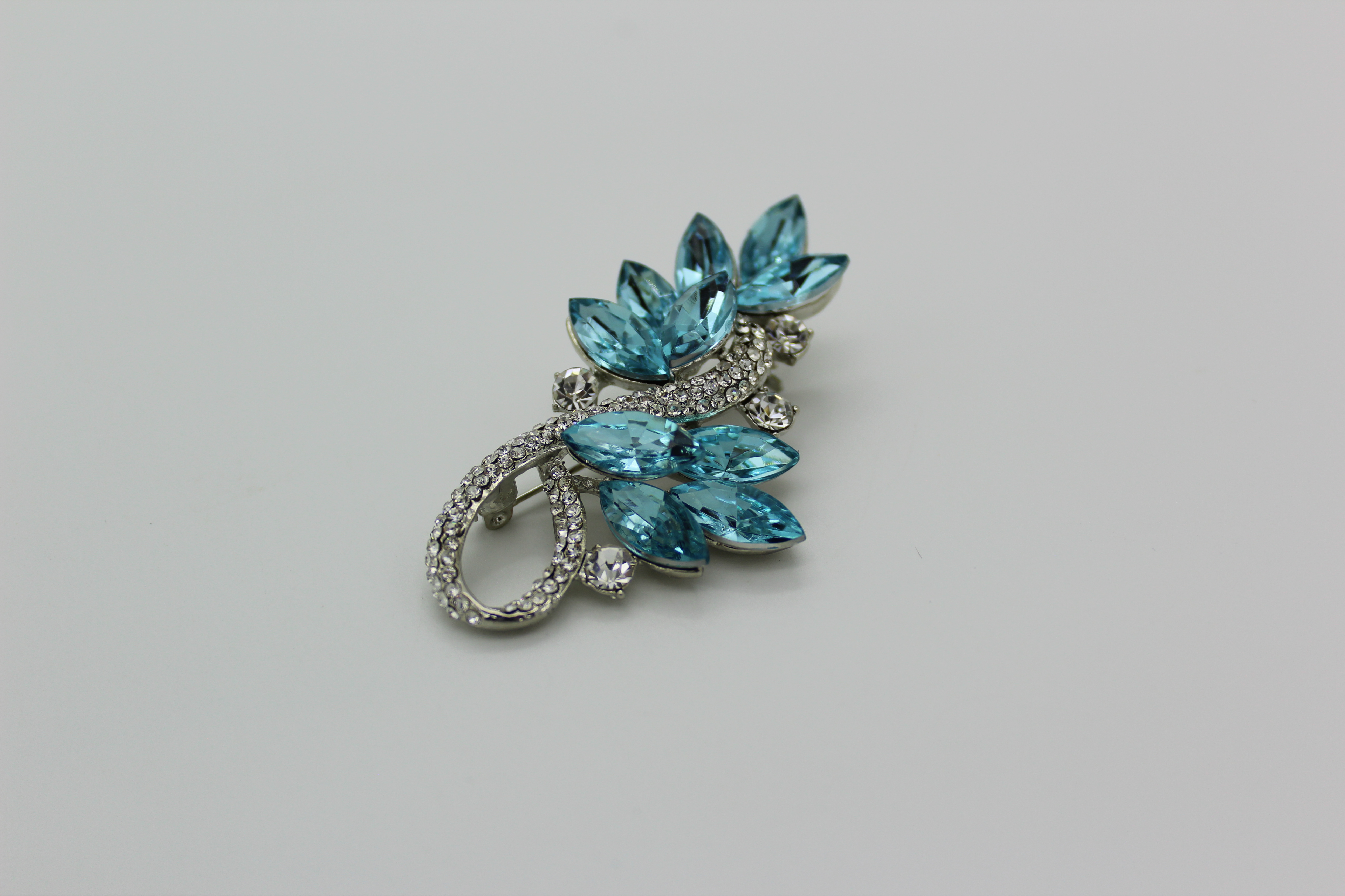 Брошь веточка из страз с голубыми лепесточками 1 шт серебро