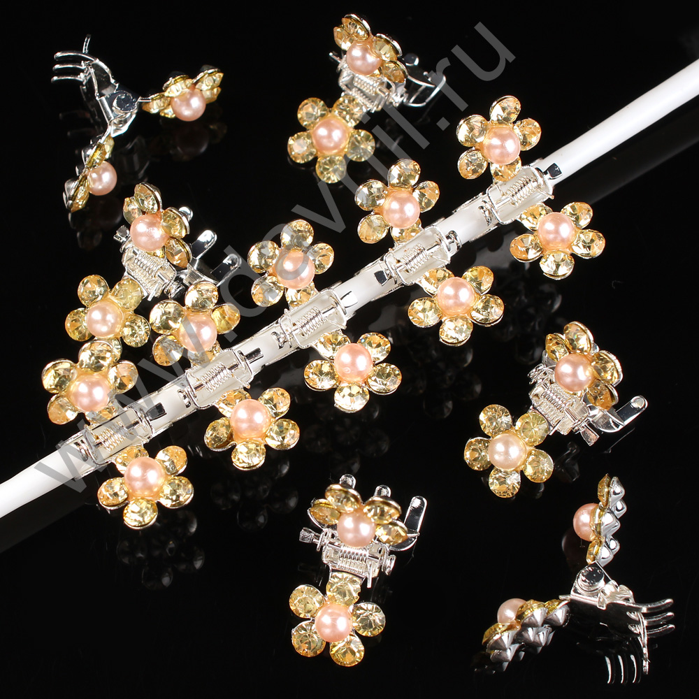 Краб для волос со стразами "Ромашка" 22*11 мм 12 шт с персиковой бусиной