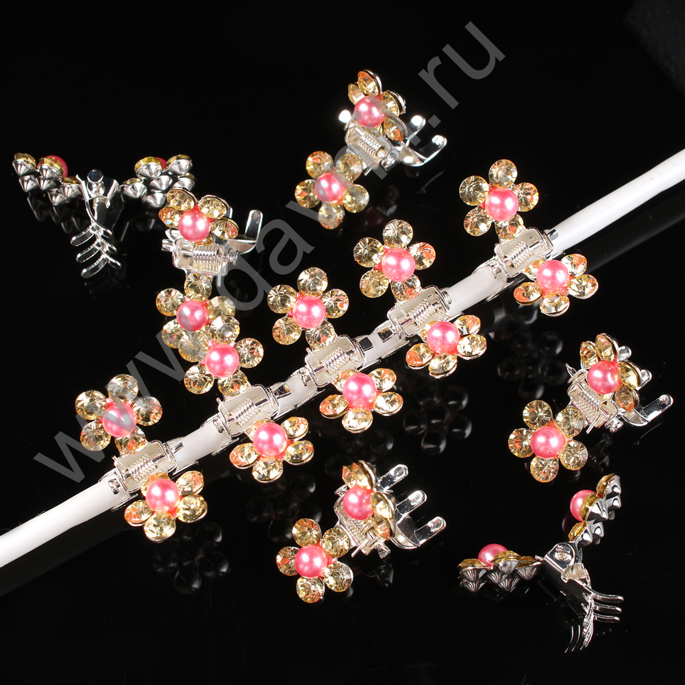 Краб для волос со стразами "Ромашка" 22*11 мм 12 шт с розовой бусиной
