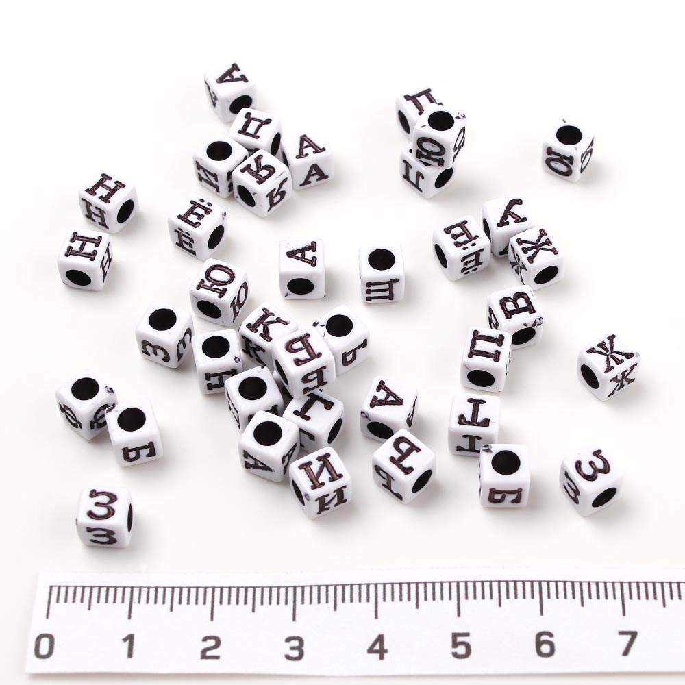 Бусины белый квадрат с чёрными буквами 6 мм 500 гр