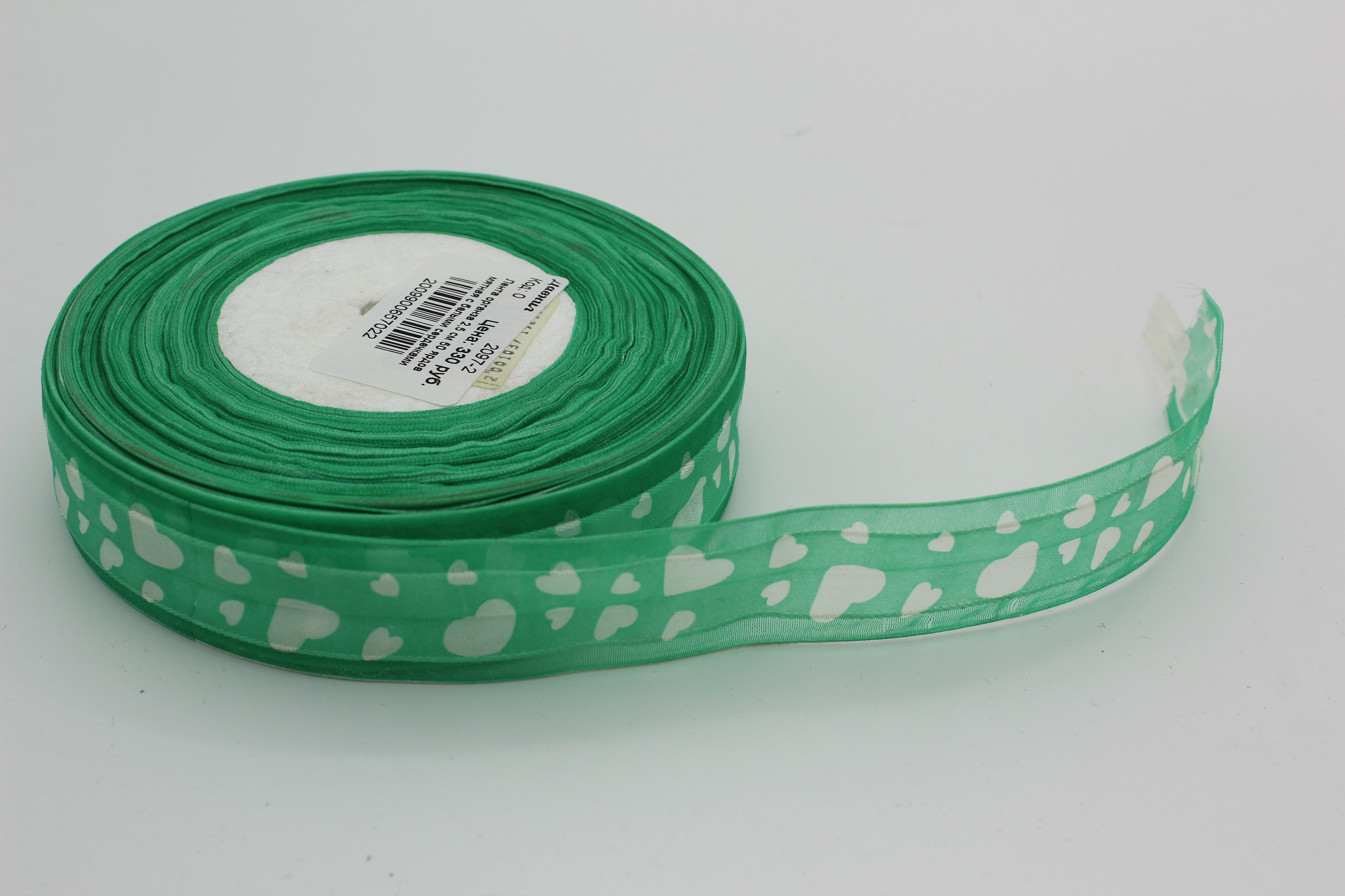 Лента органза 2,5 см 50 ярдов мятная с белыми сердечками