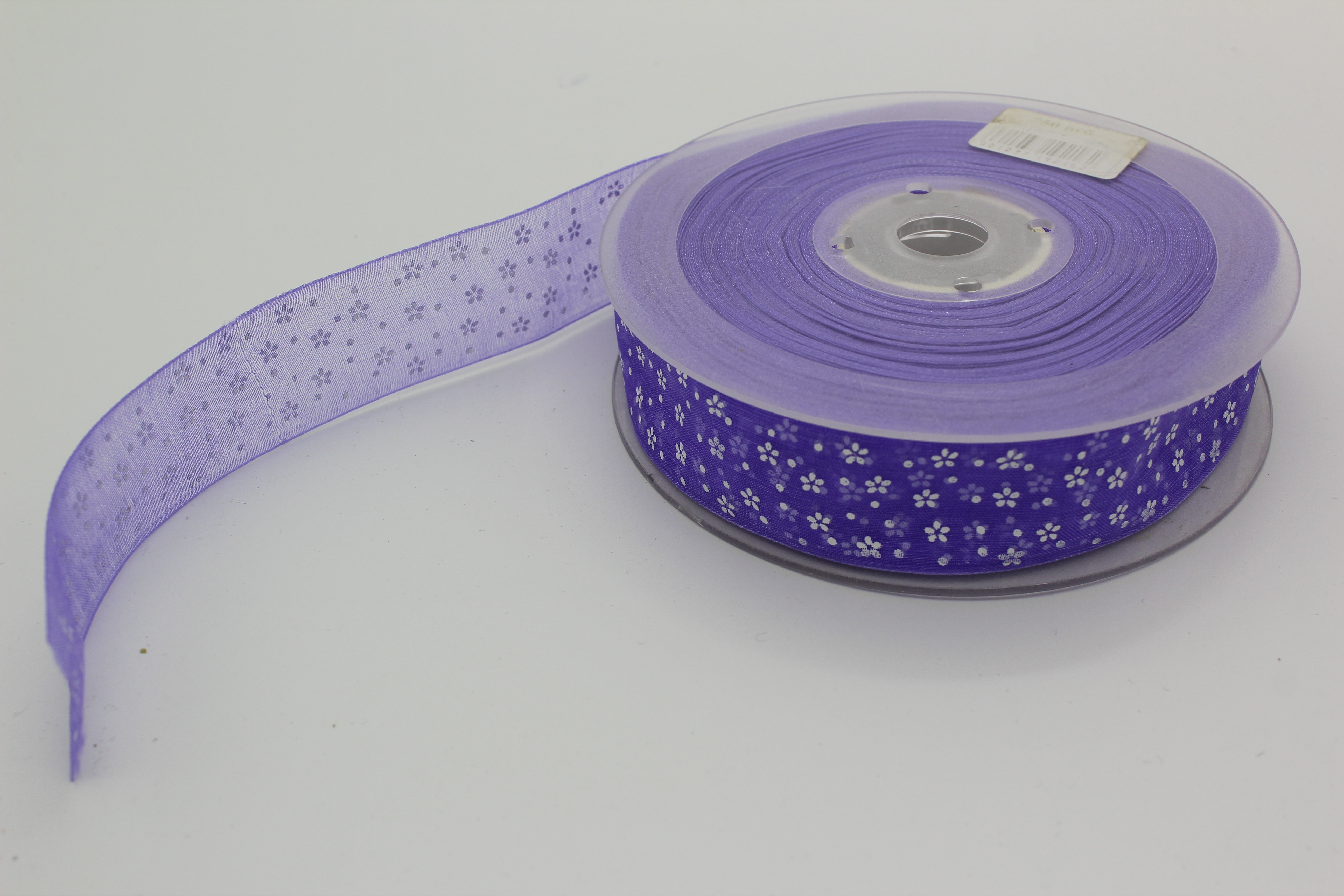 Лента органза 2,5 см 80 ярдов сиреневая с белыми цветочками