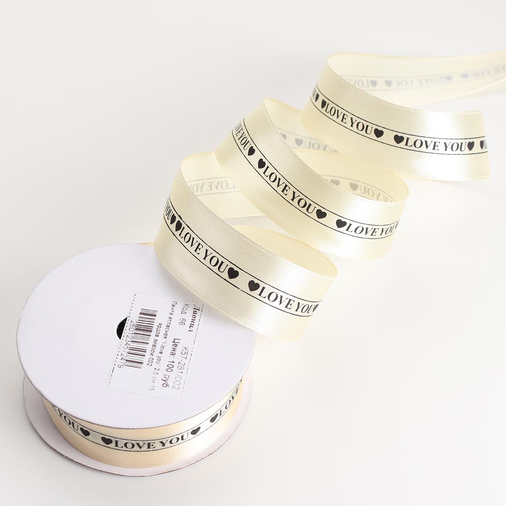 Лента атласная “I Love you” 2,5 см 15 ярдов айвори 002