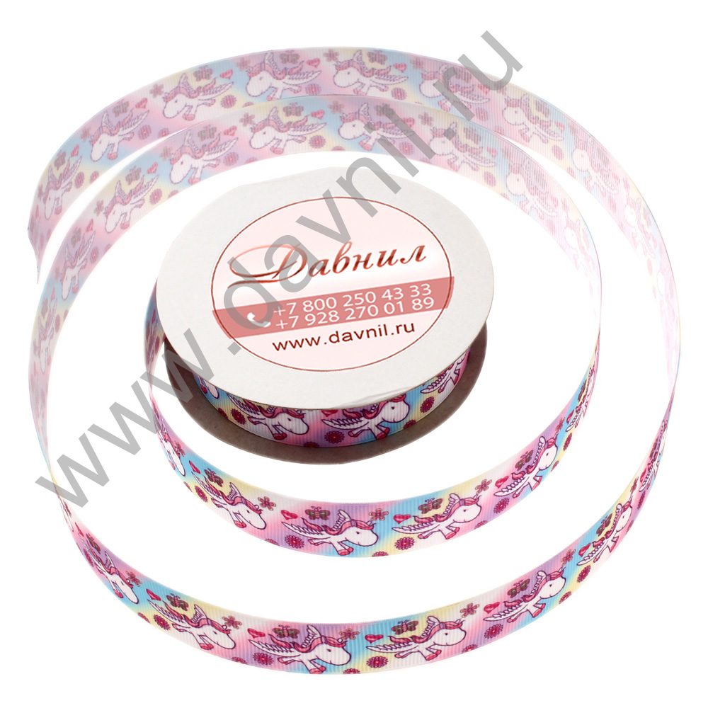 Лента репсовая декоративная "Радуга и единороги" 2,5 см*10 ярдов розовая
