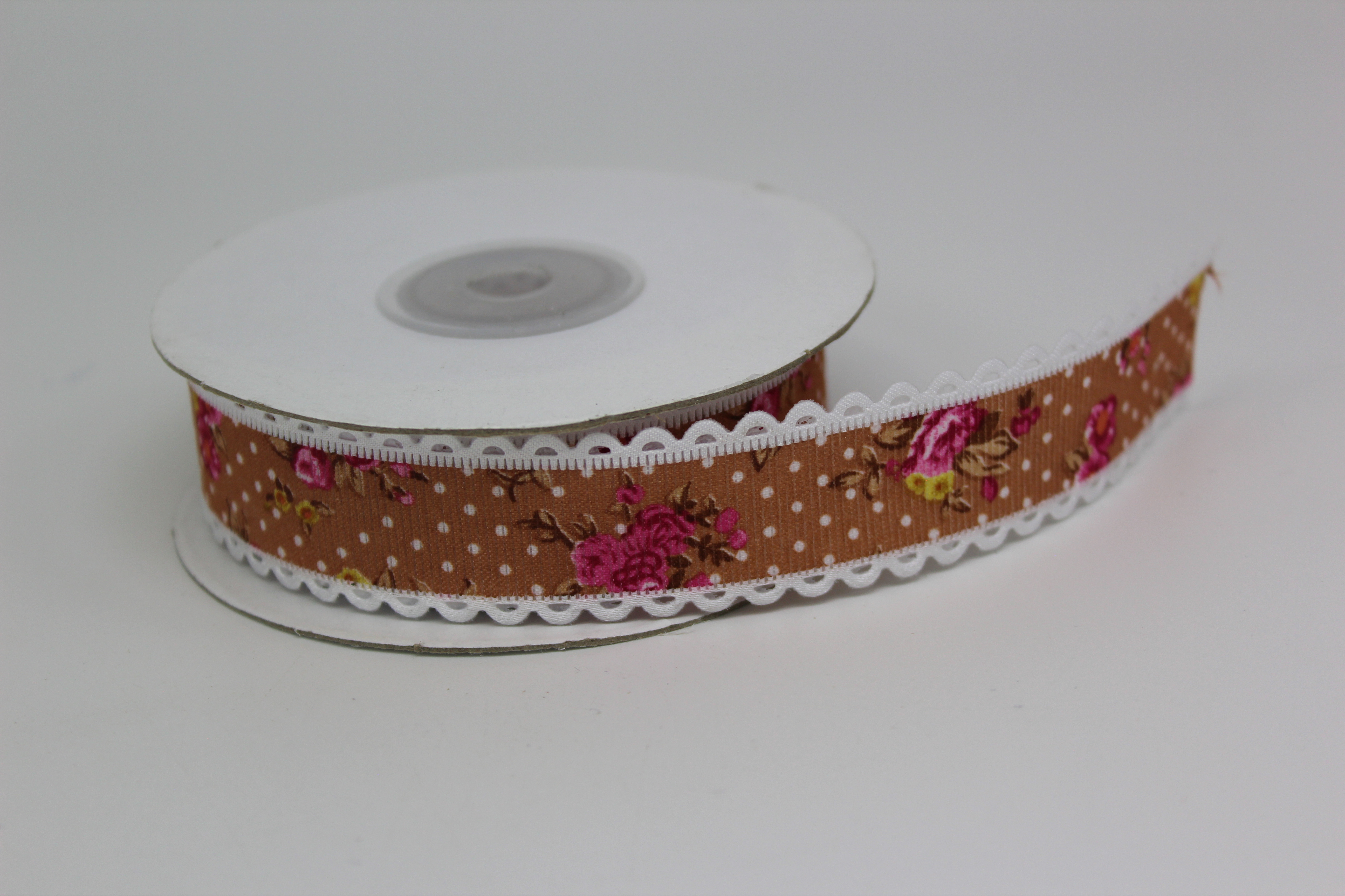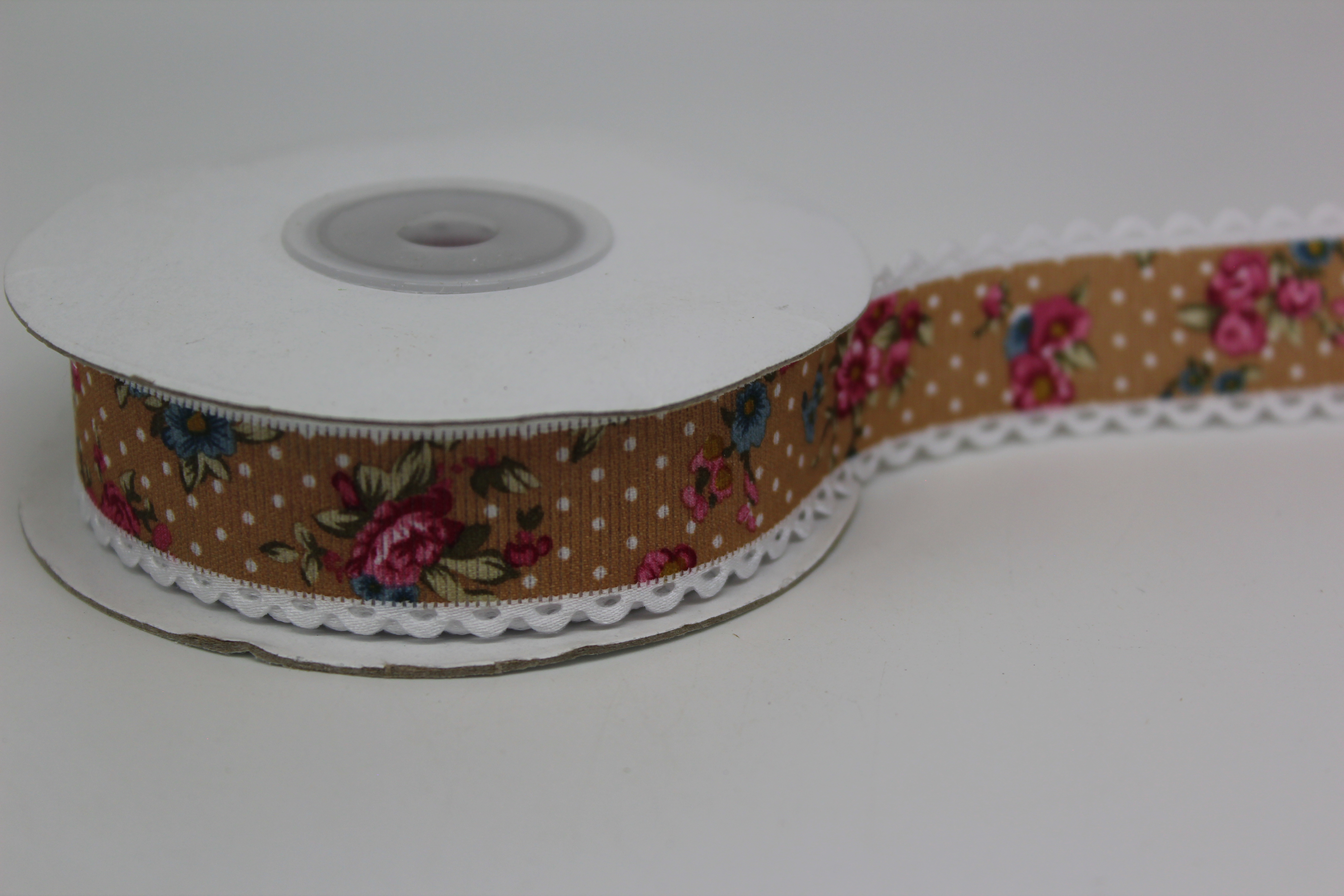 Лента тканевая с кружевной окантовкой 2,5 см 15 ярд "Цветочек" коричневый