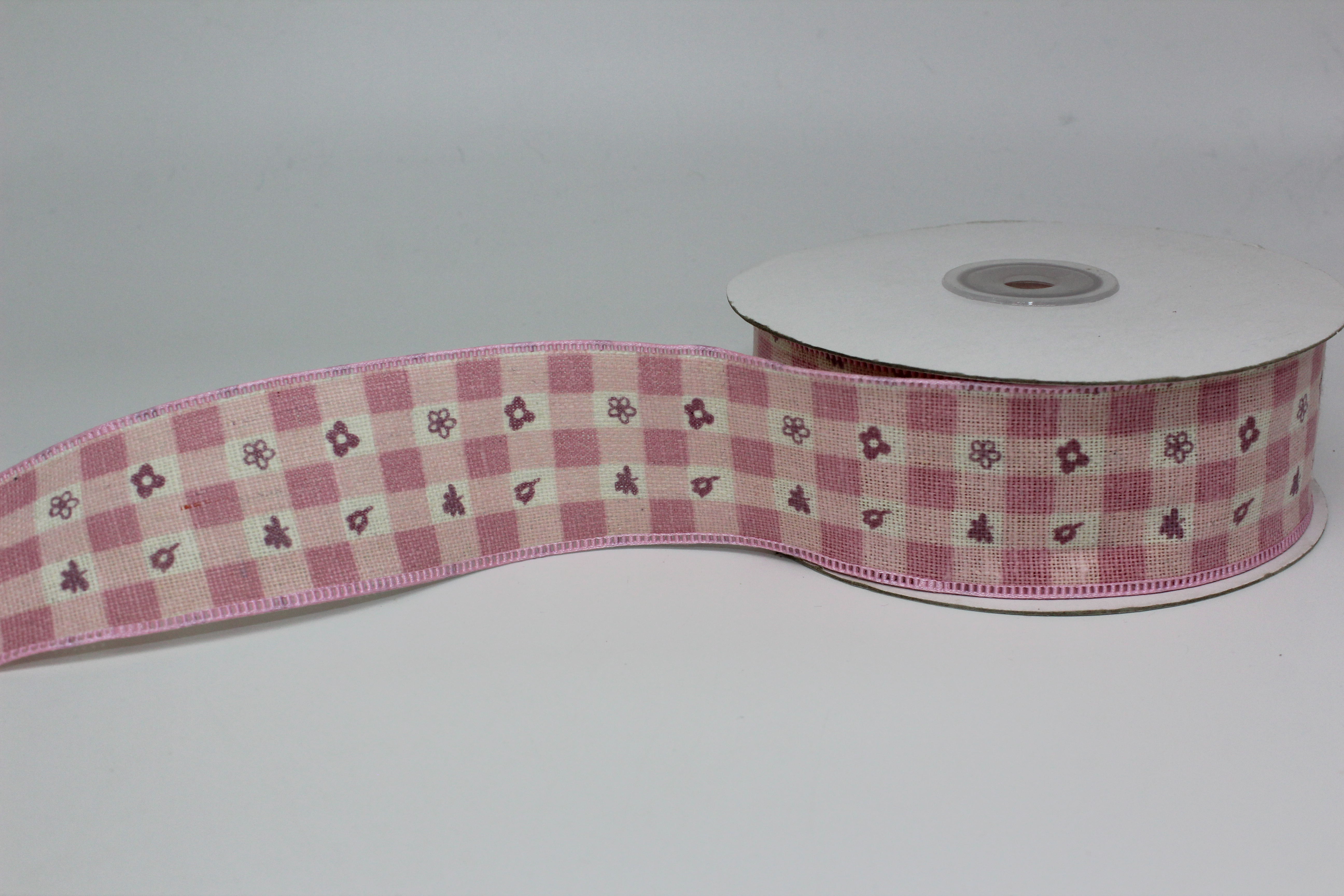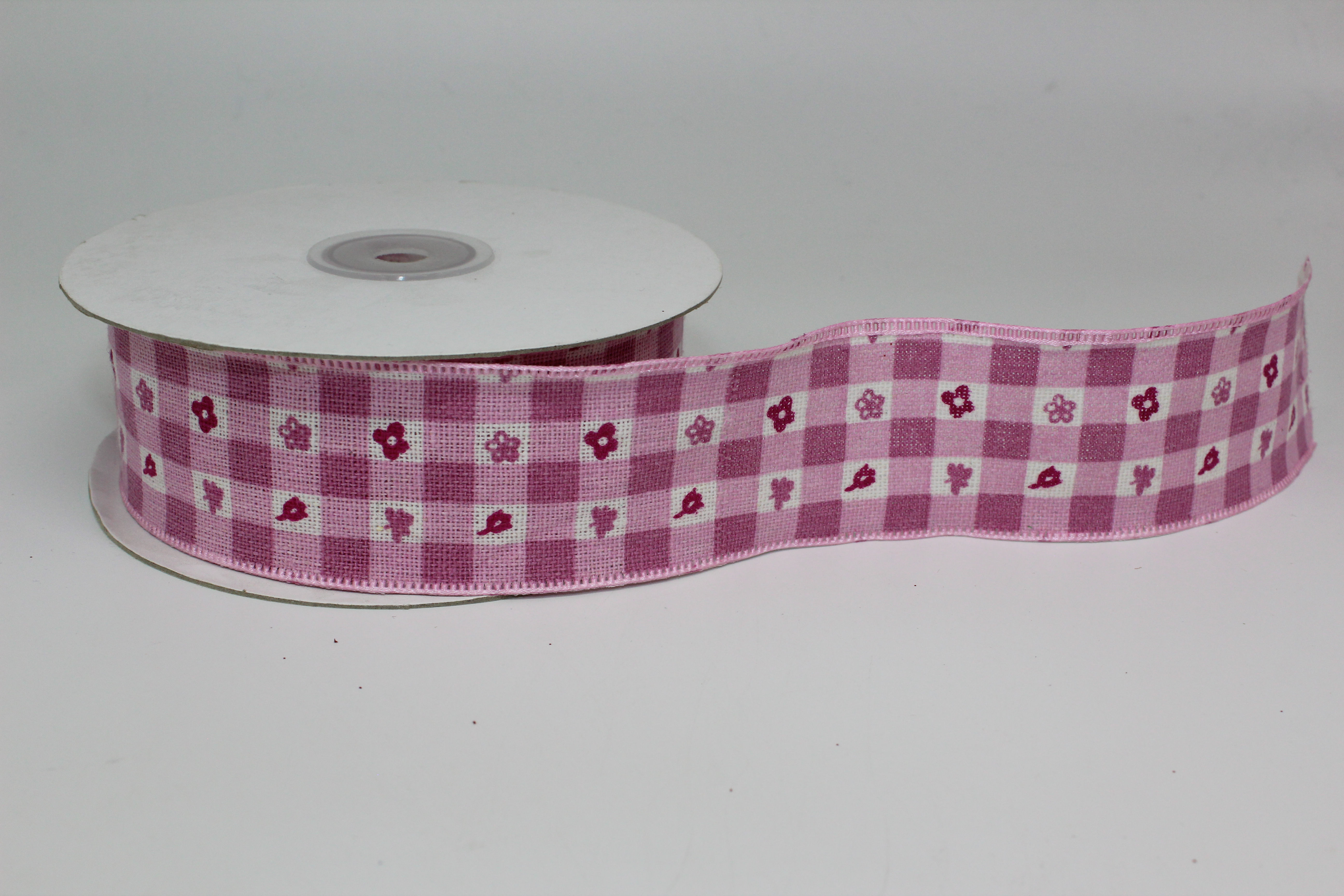 Лента лён клетка с цветочками 4 см 20 ярдов пенка