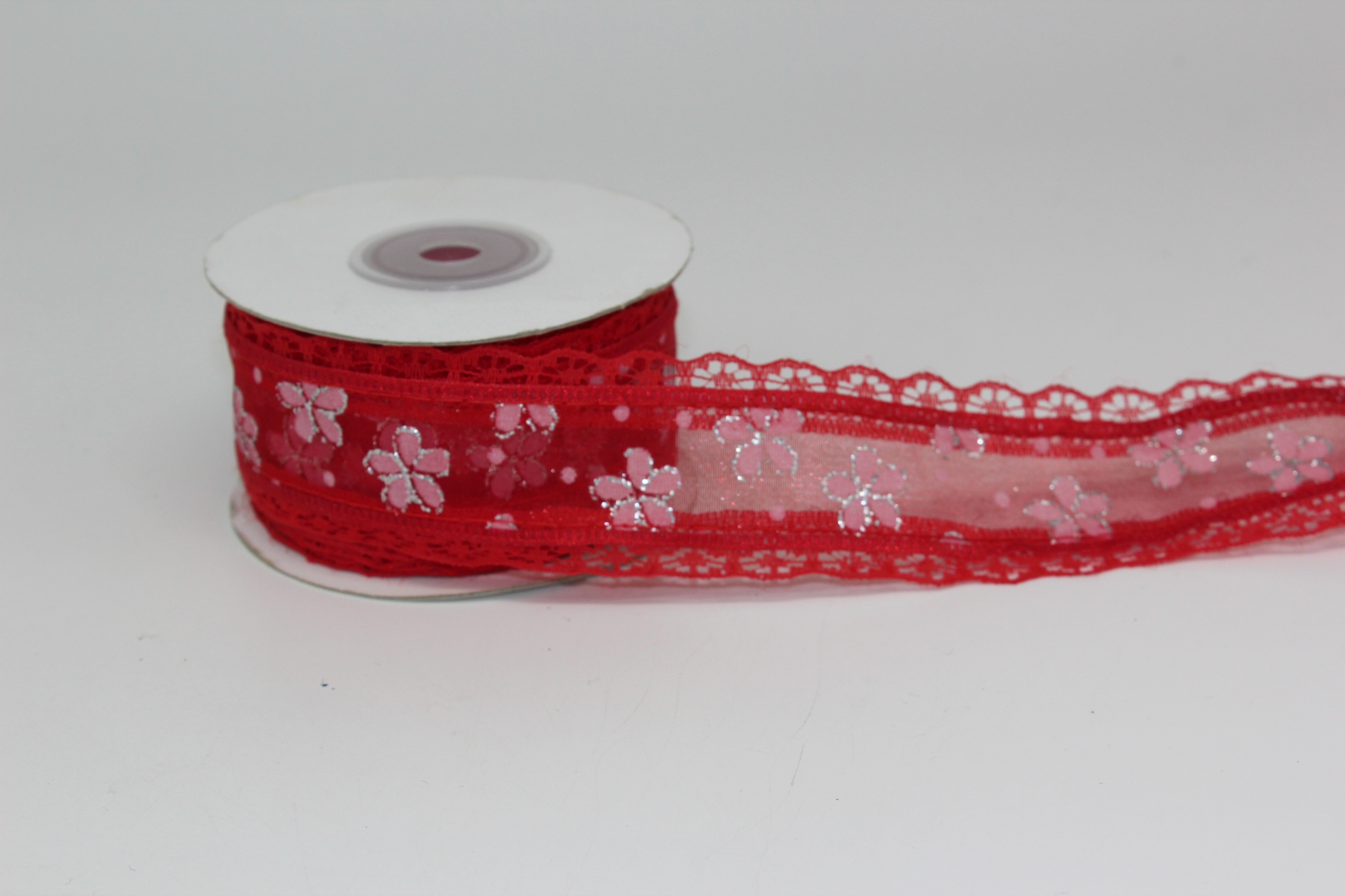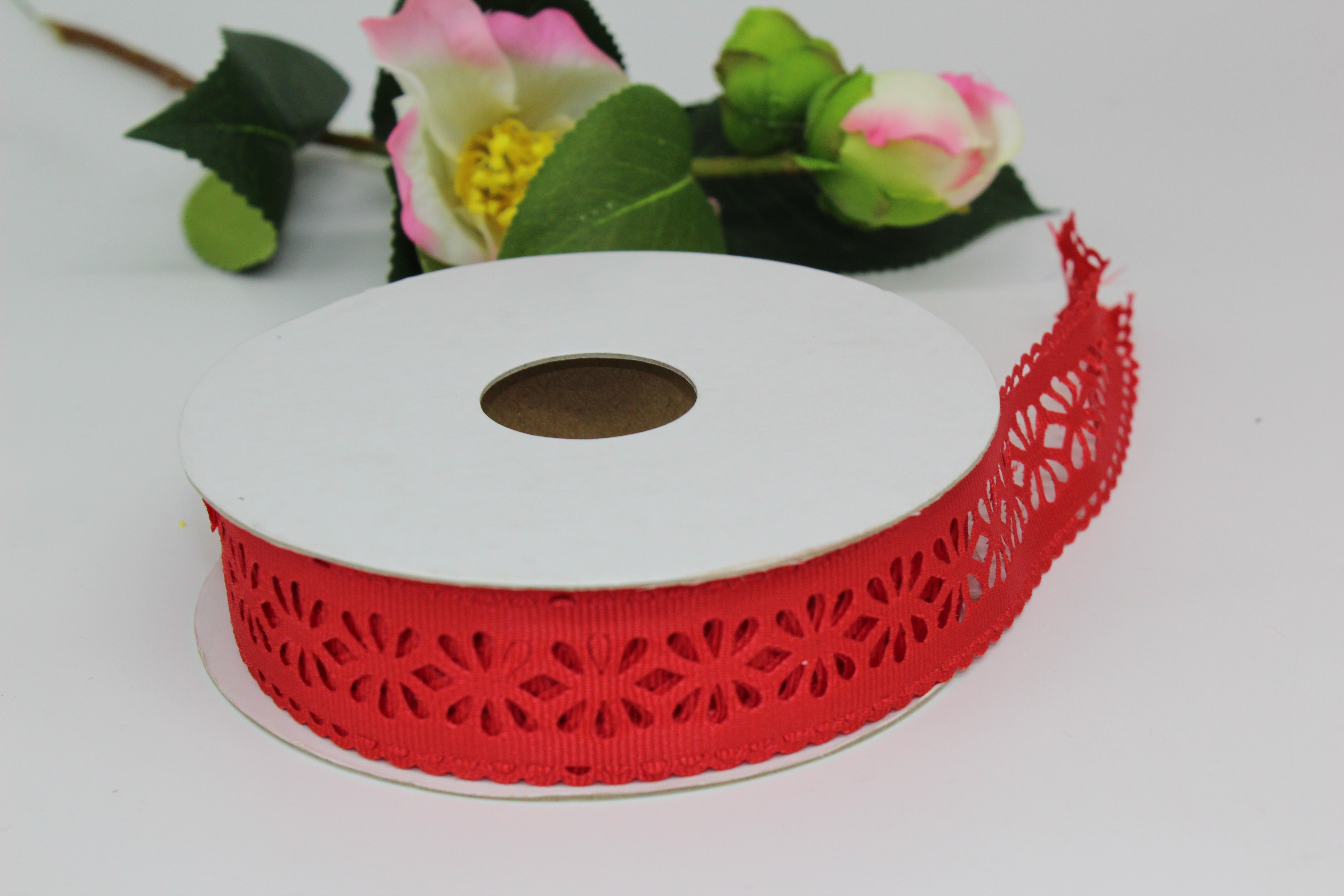Лента репсовая с прорезанными цветочками 2,5 см 25 ярдов красная