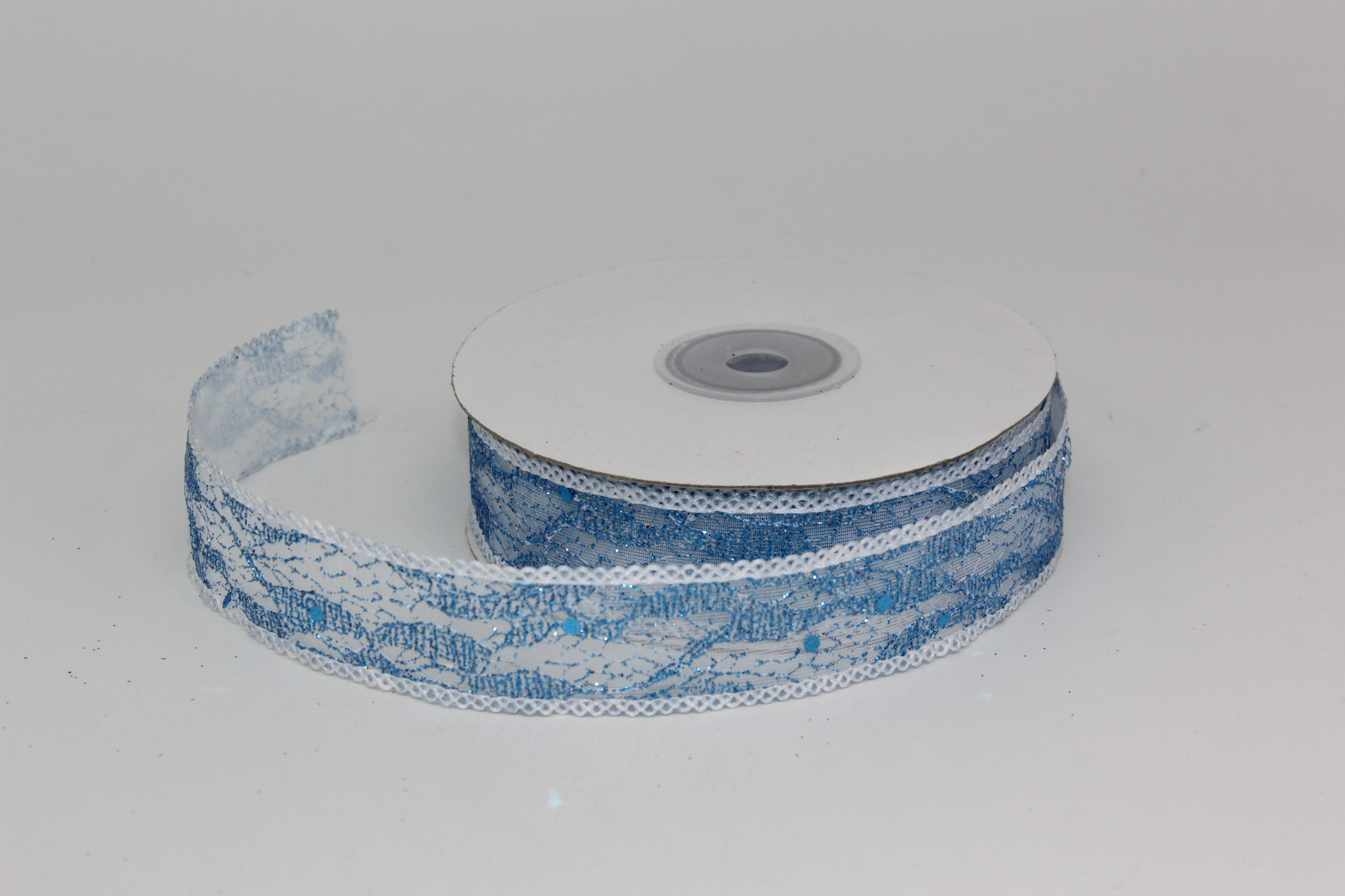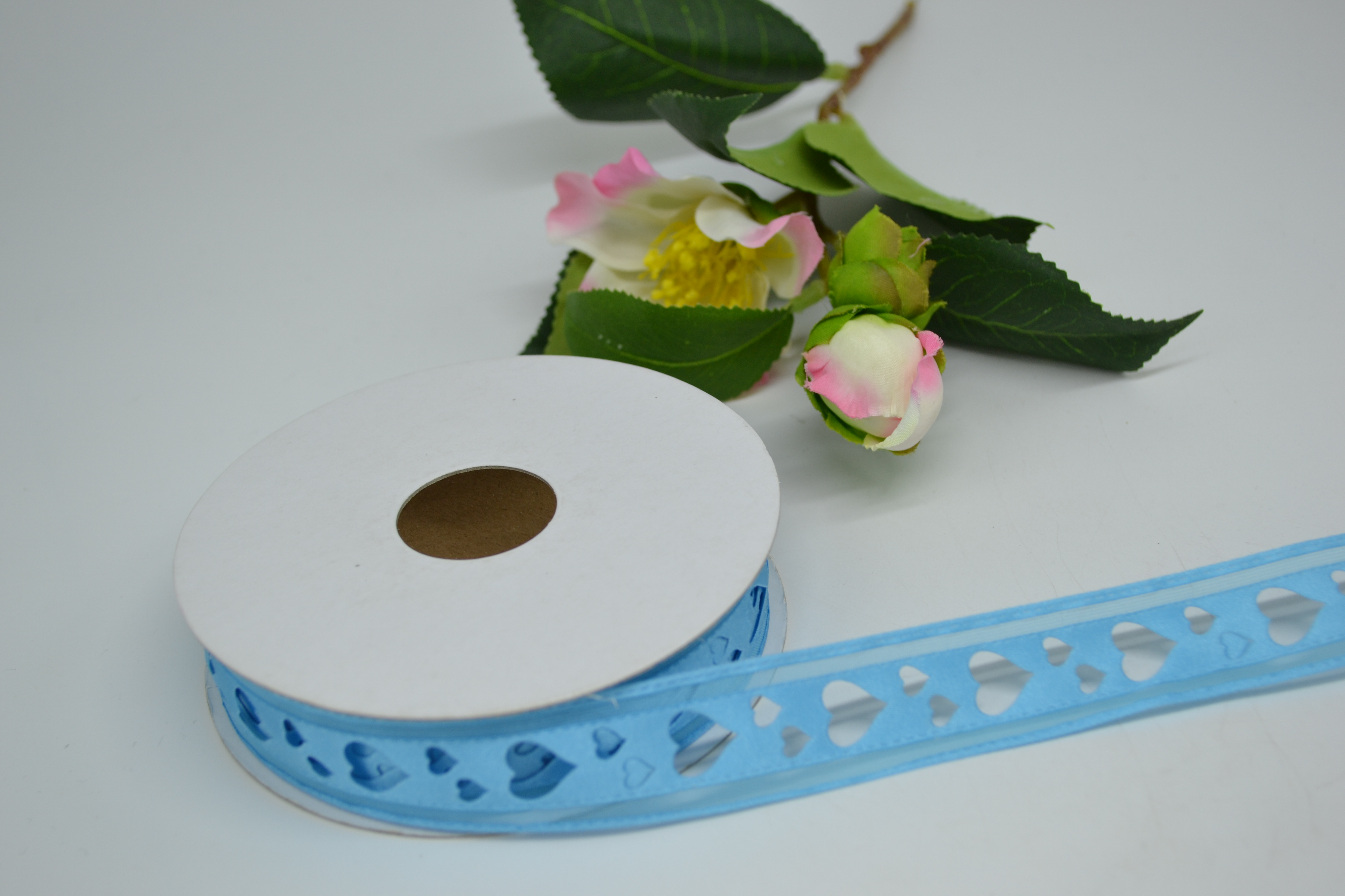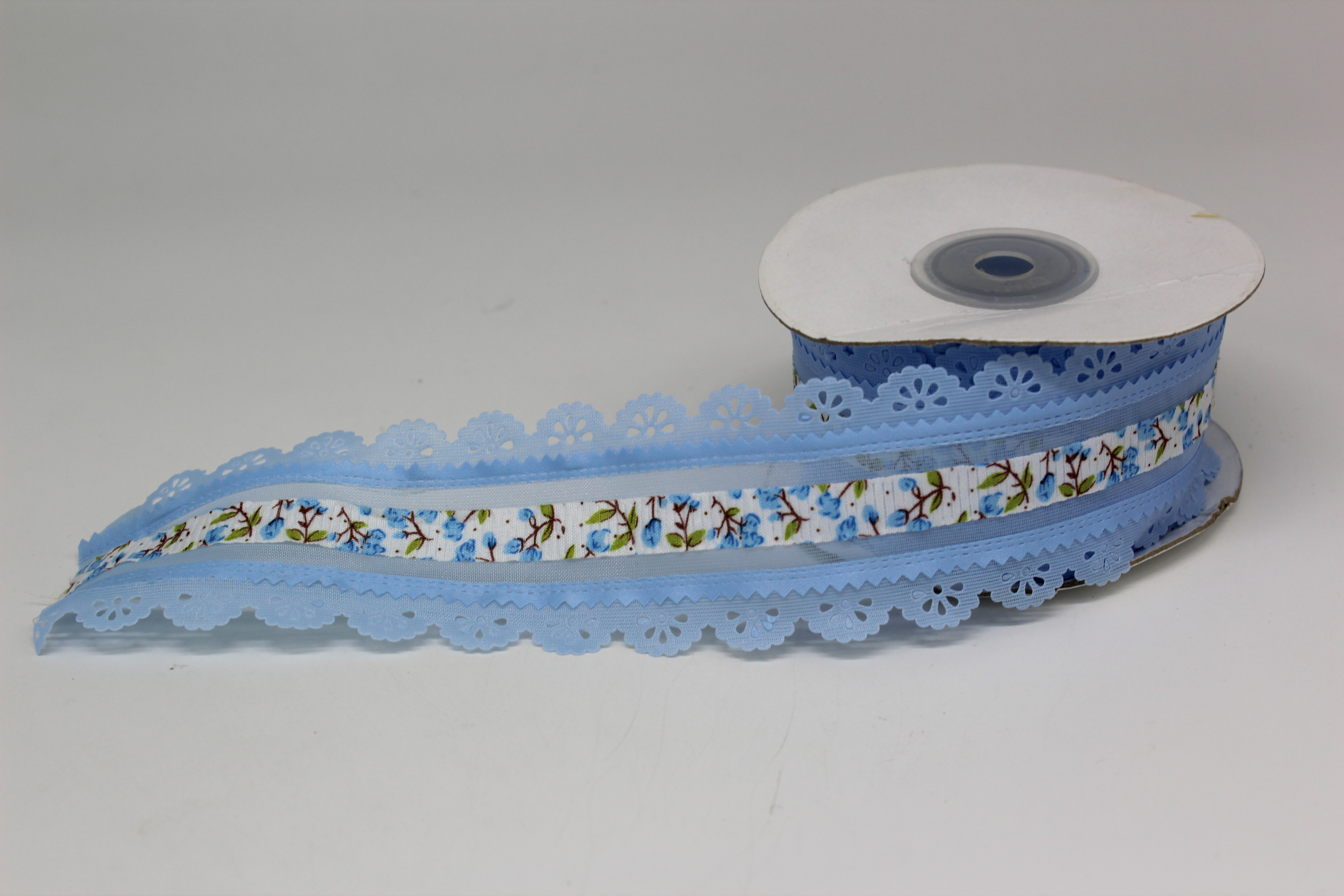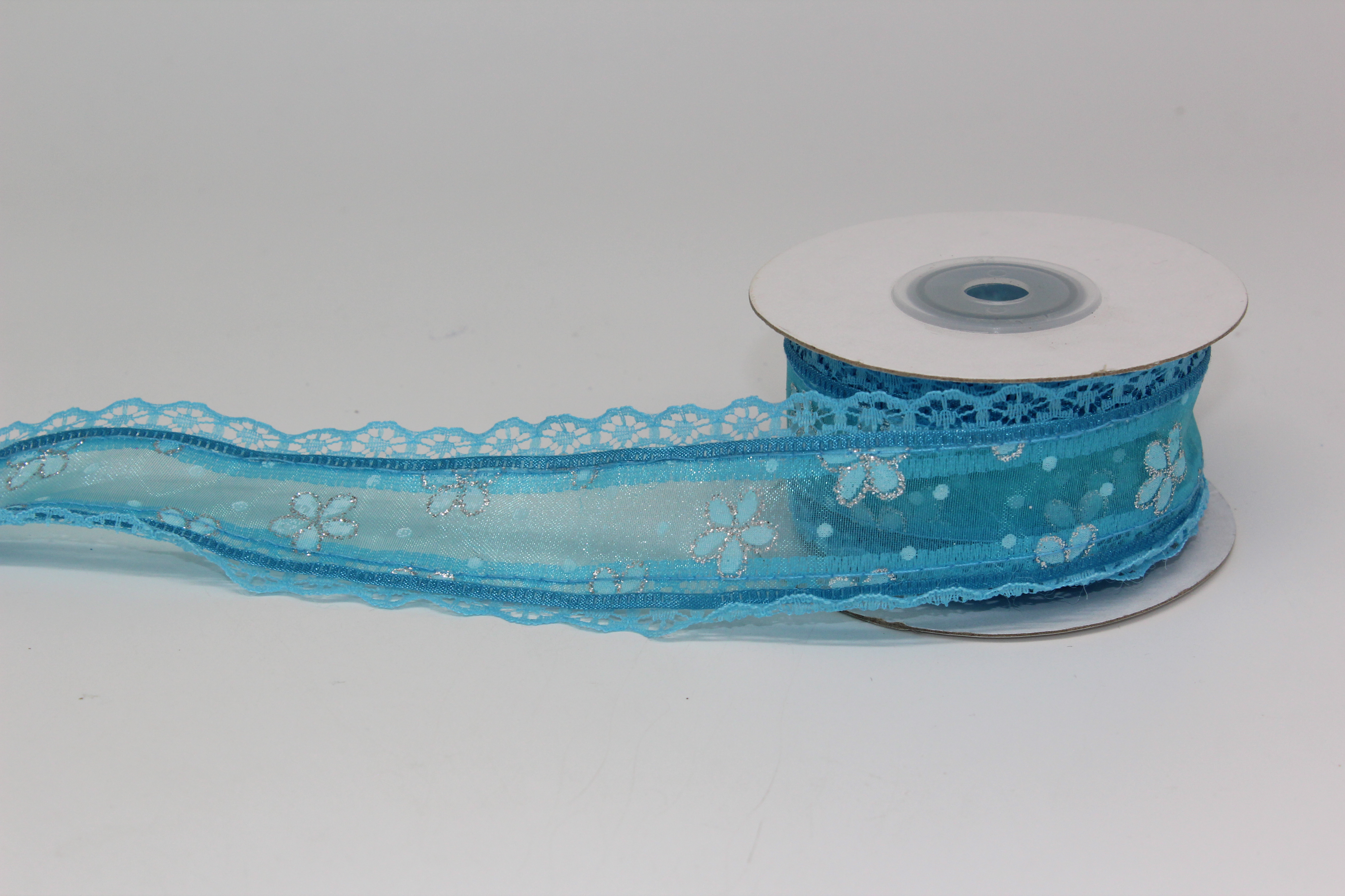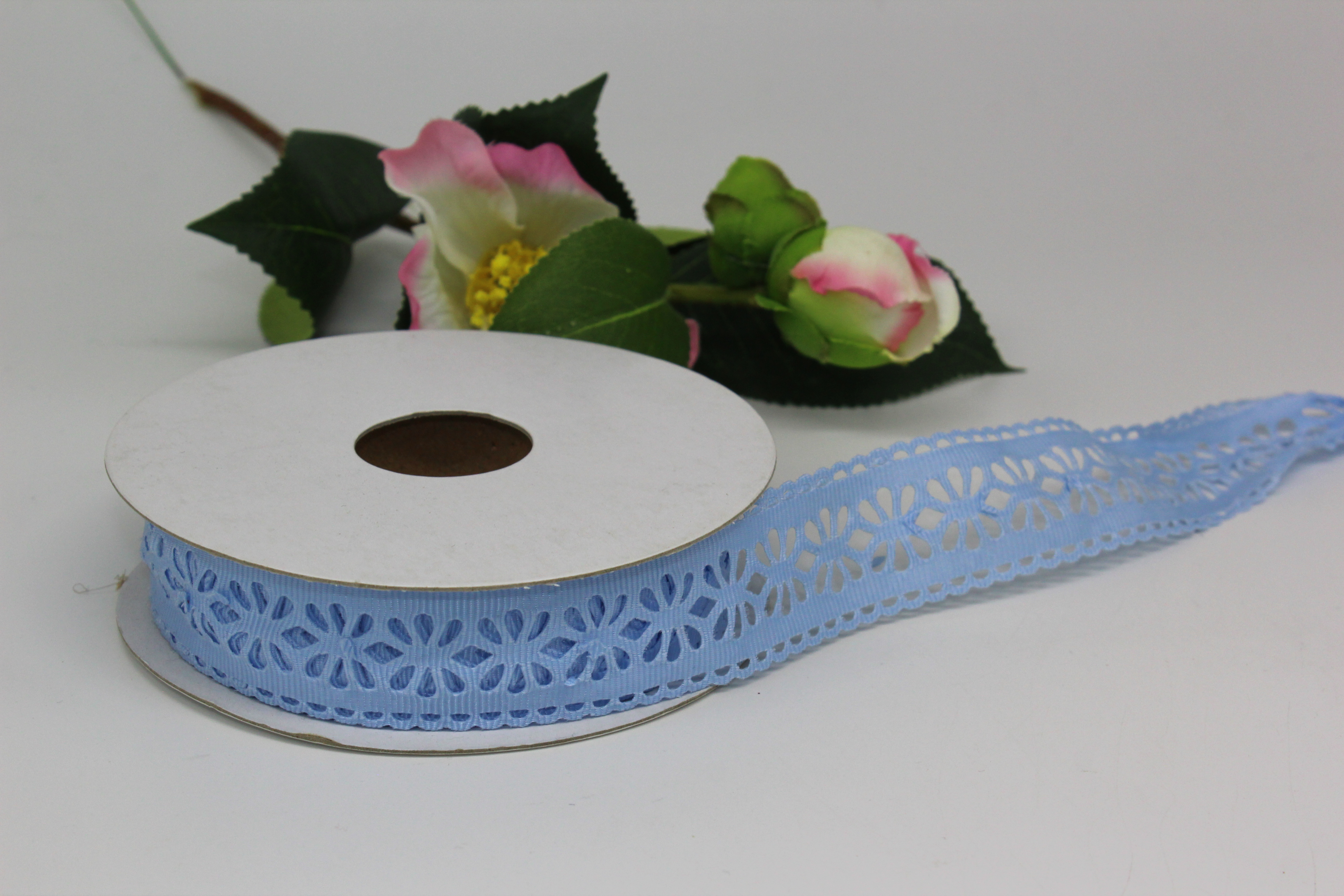Лента репсовая с прорезанными цветочками 2,5 см 25 ярдов голубая