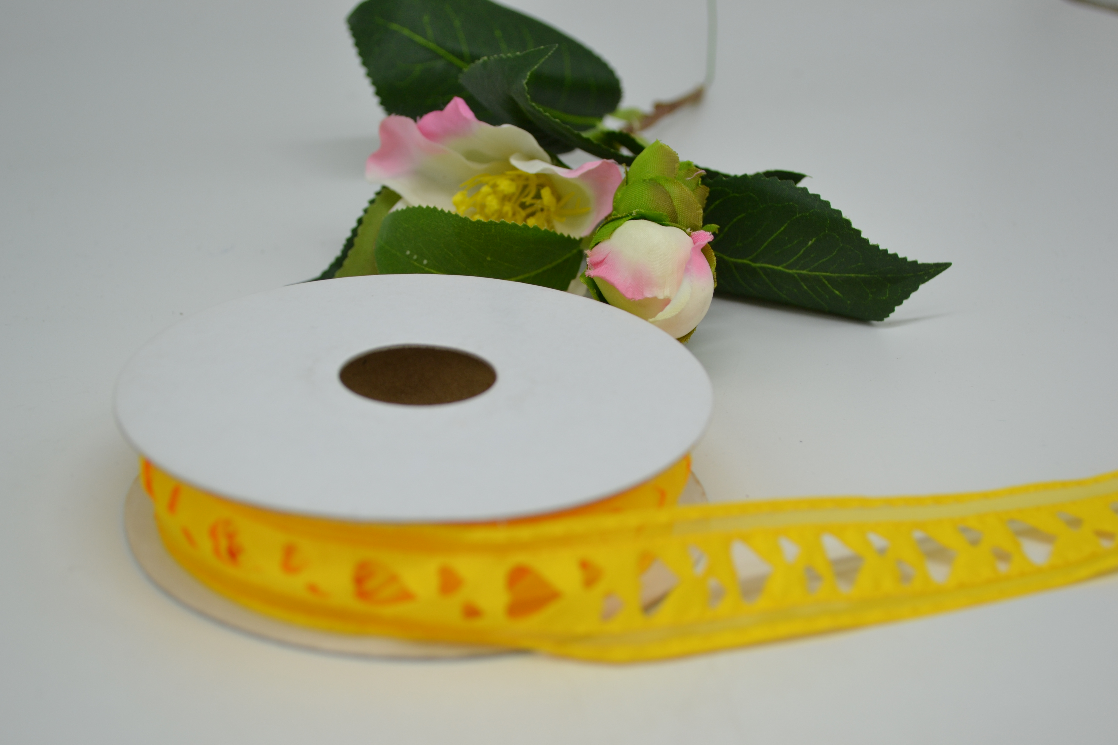Лента атласная с прорезанными сердечками 2,5 см 25 ярдов жёлтая