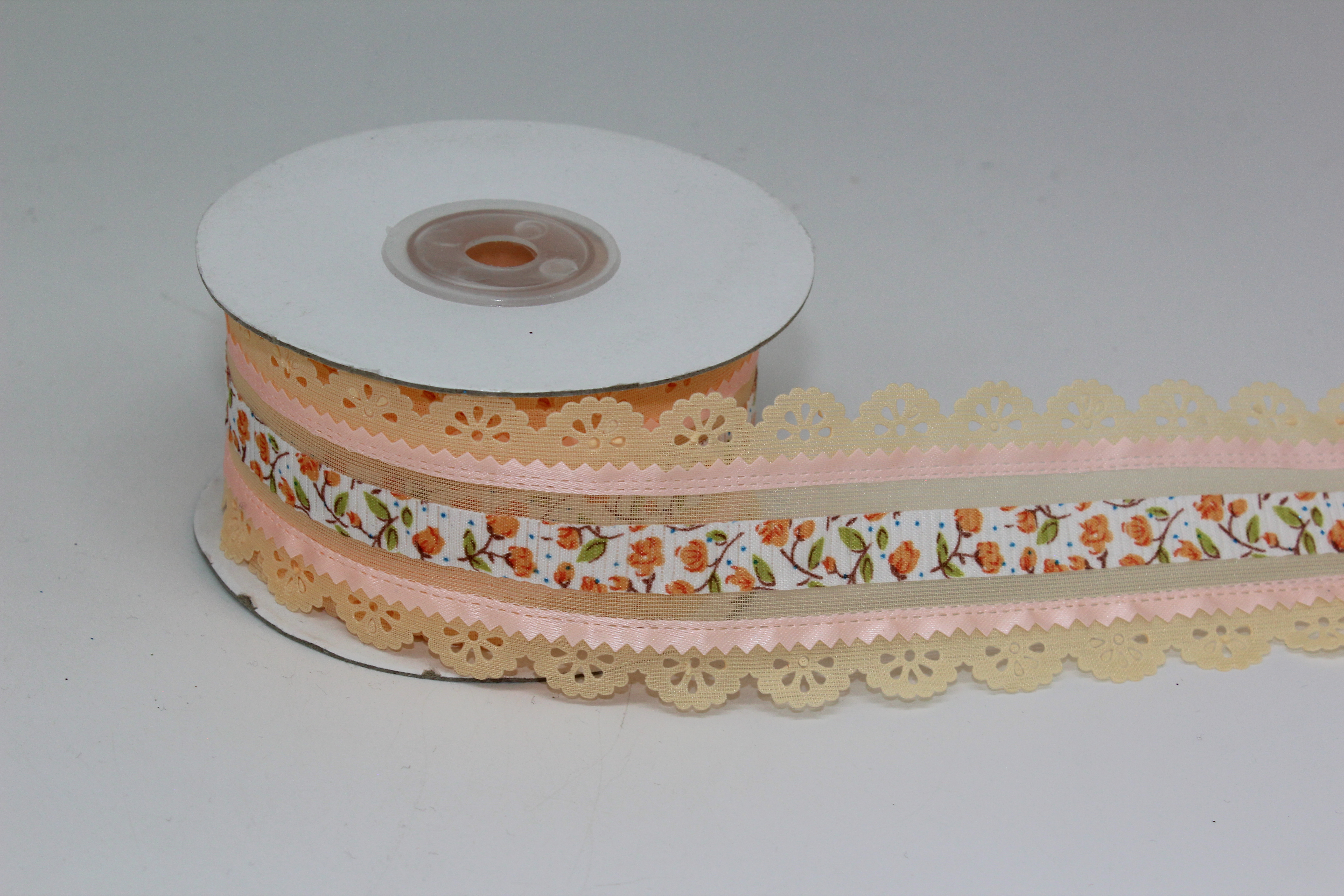 Лента п/э с кружевной окантовкой 4 см 10 ярдов мелкий цветок розовая