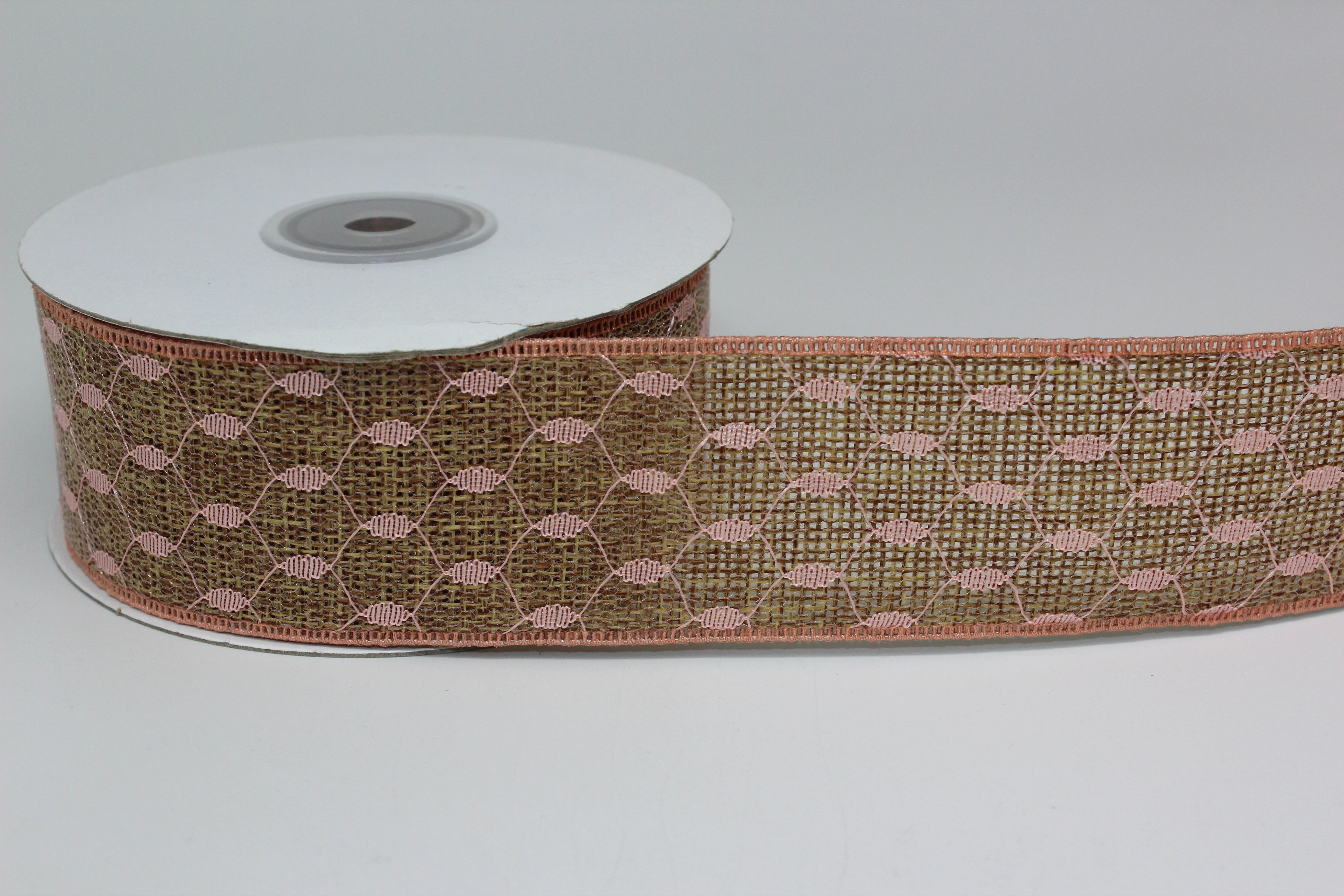 Лента мешковина 4 см 10 ярдов с светло розовым рисунком