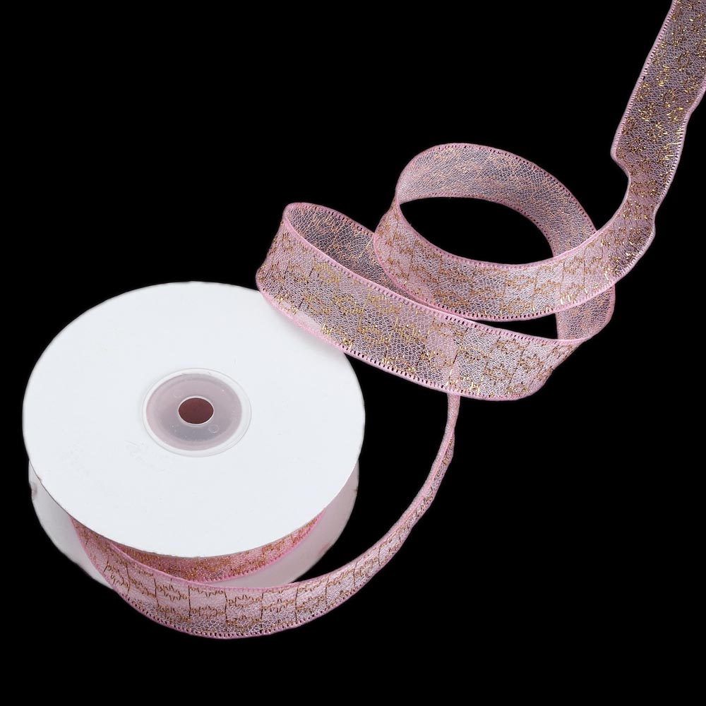 Лента паутинка с золотым люриксои 2,5 см 15 ярдов розовая