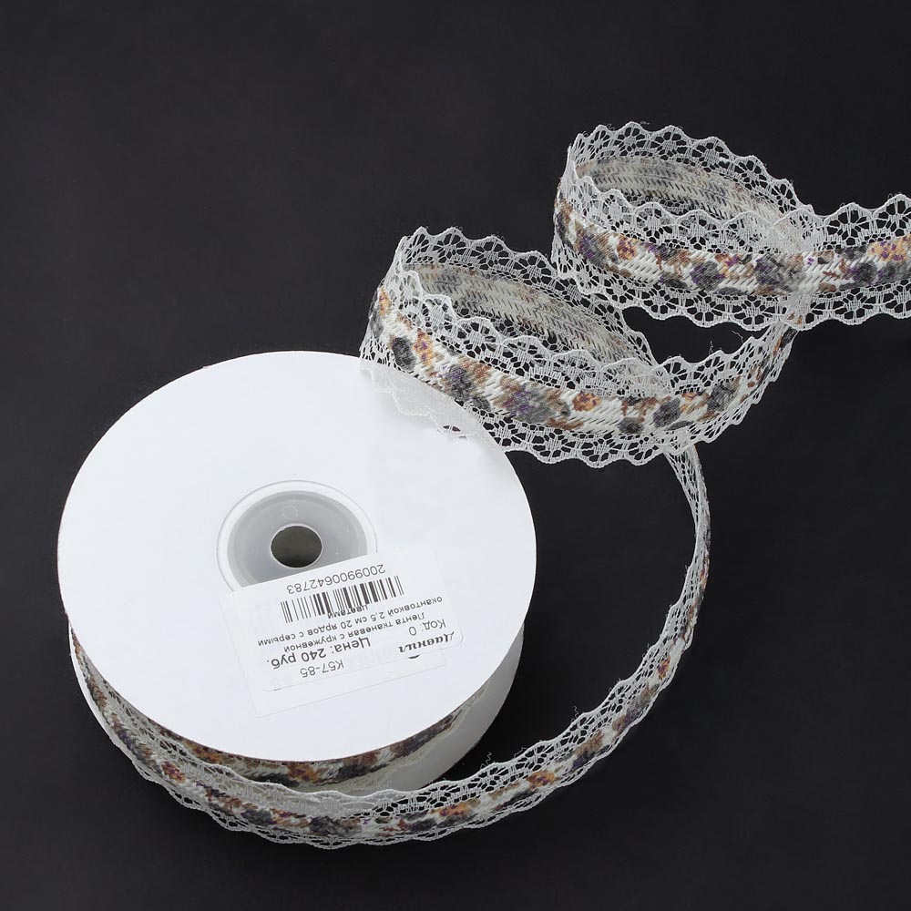 Лента тканевая с кружевной окантовкой 2,5 см 20 ярдов с серыми цветами