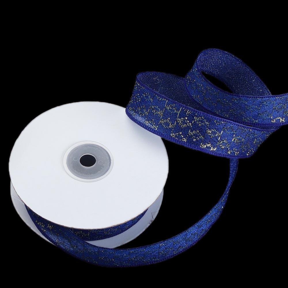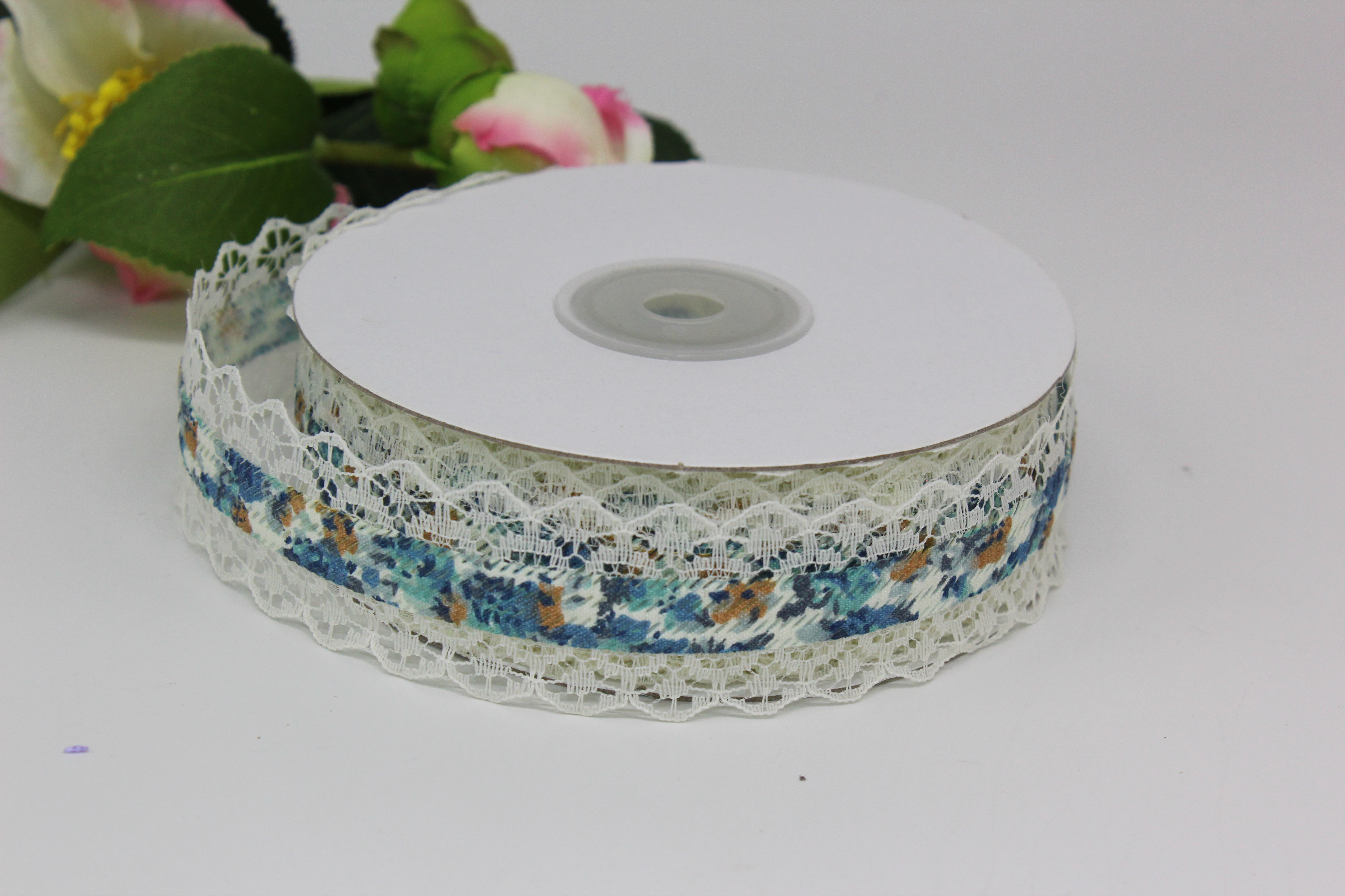 Лента тканевая с кружевной окантовкой 2,5 см 20 ярдов с голубыми цветами