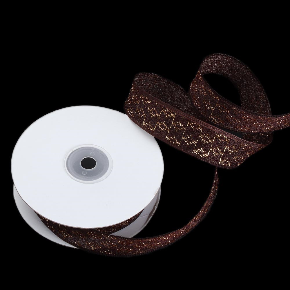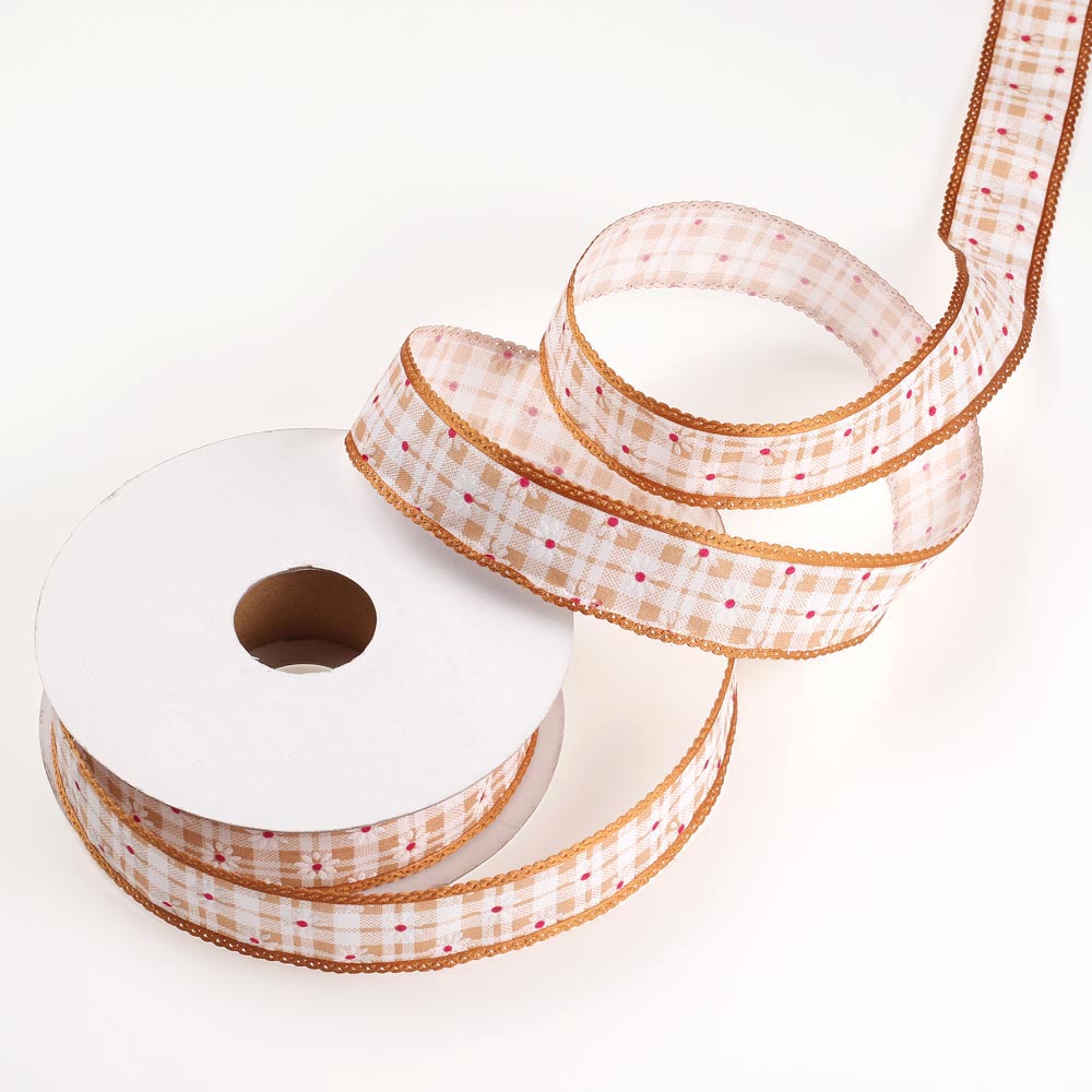 Лента тканевая с кружевной окантовкой 2,5 см 20 ярдов с коричневыми цветами