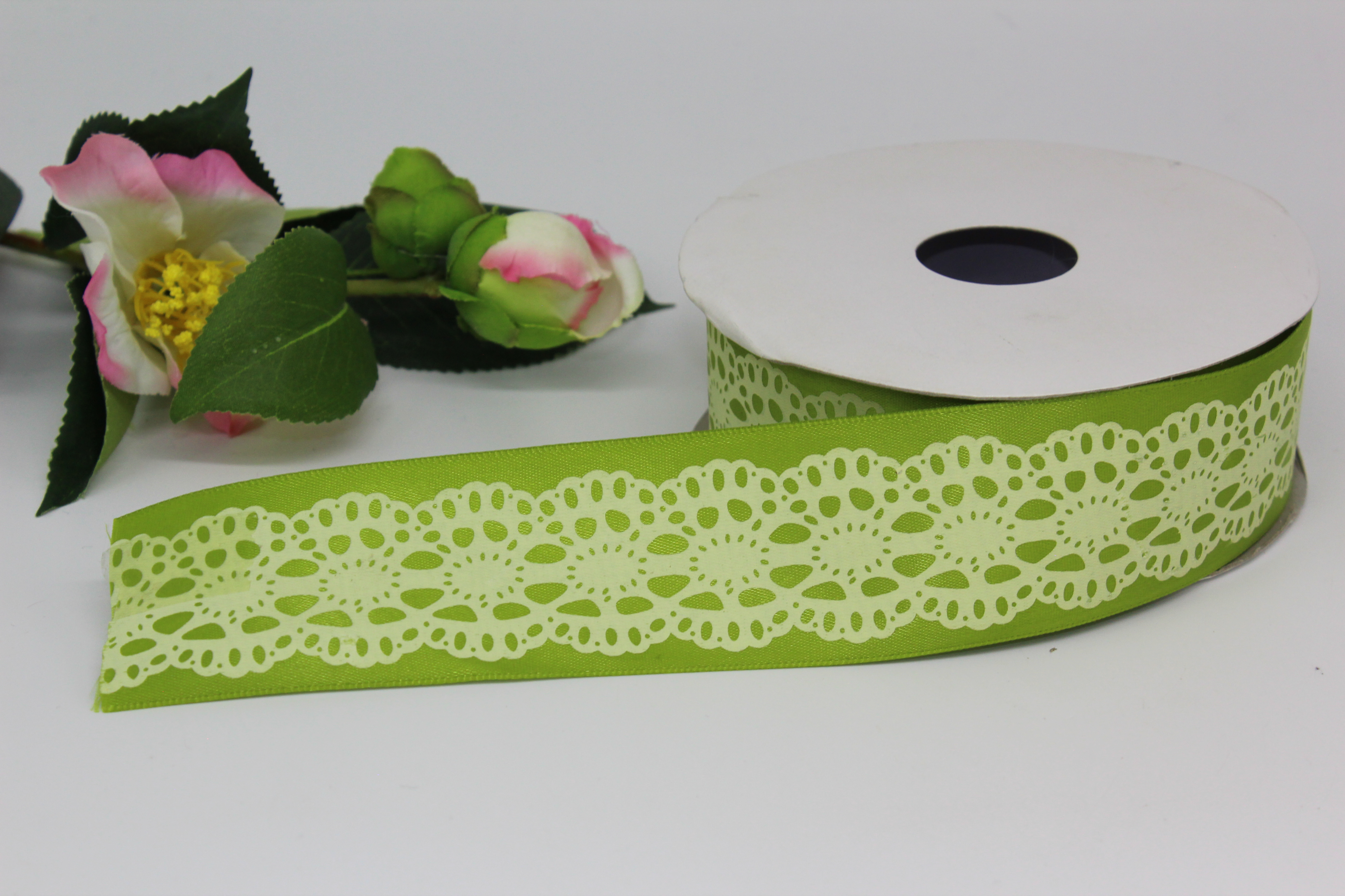 Лента атласная 4 см 25 ярдов с кружевным рисунком хаки