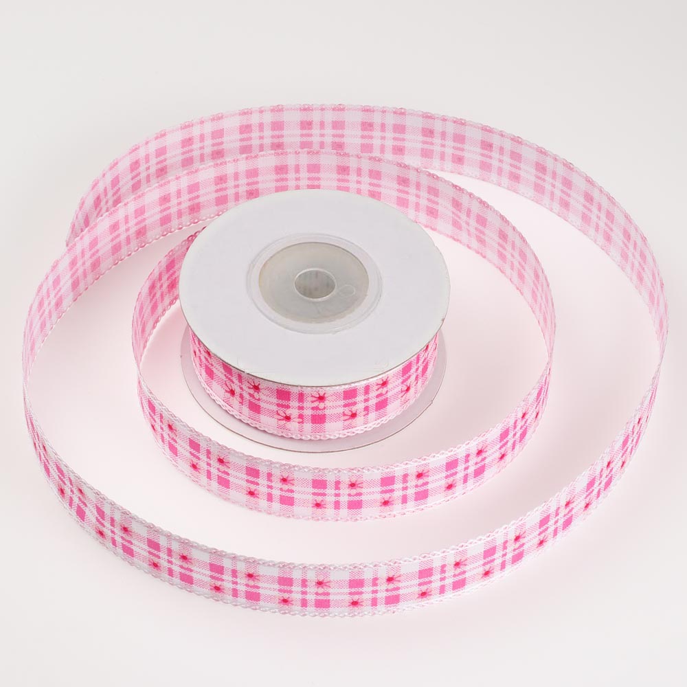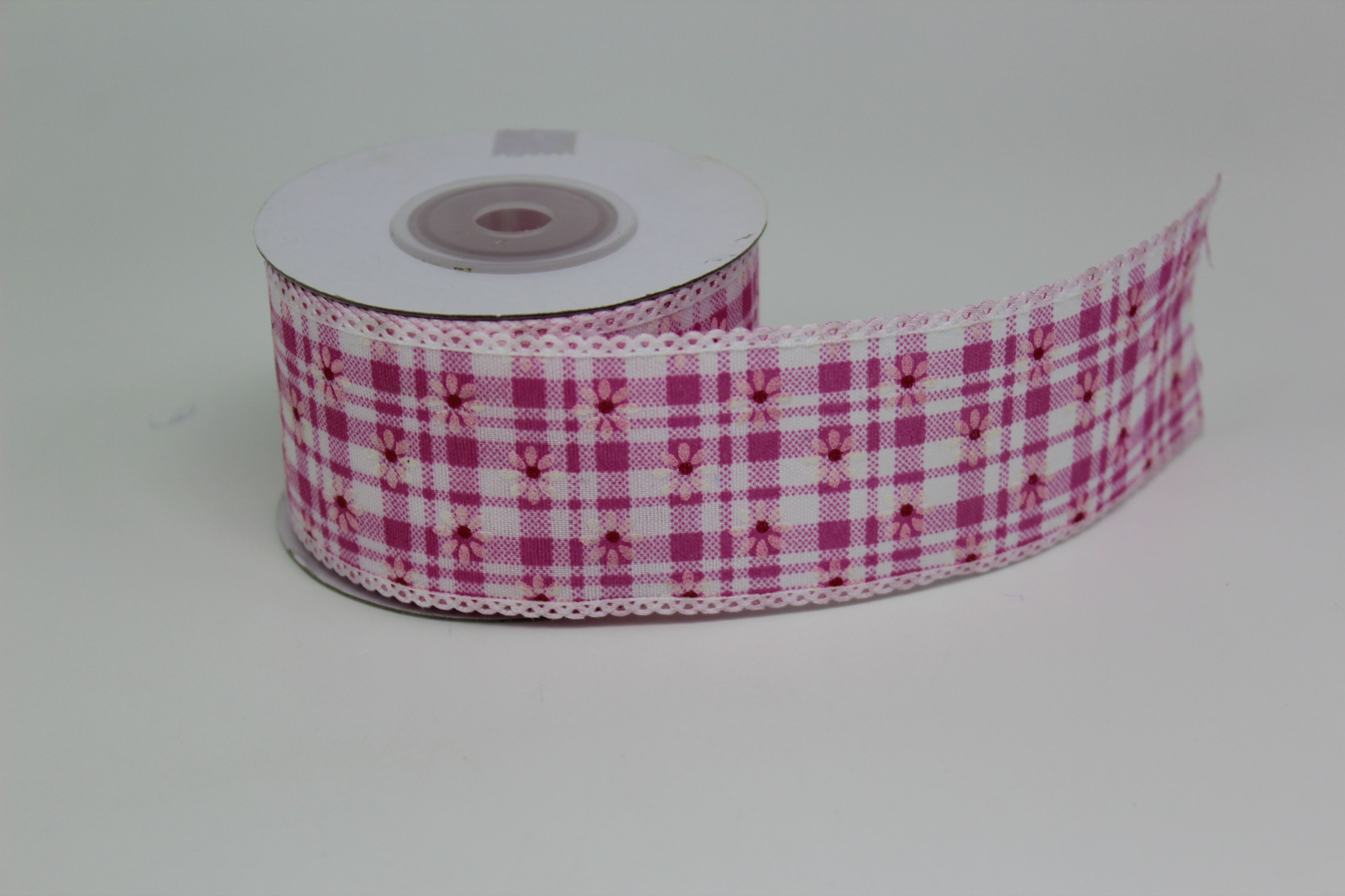 Лента тканевая с кружевной окантовкой 2,5 см 15 ярдов"Клетка с ромашкой" фуксия