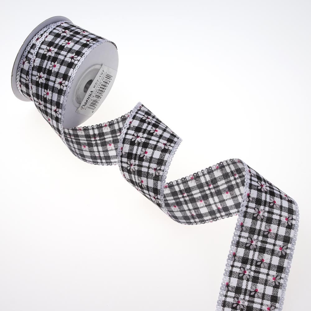 Лента тканевая с кружевной окантовкой 2,5 см 15 ярдов "клетка с ромашкой"чёрная