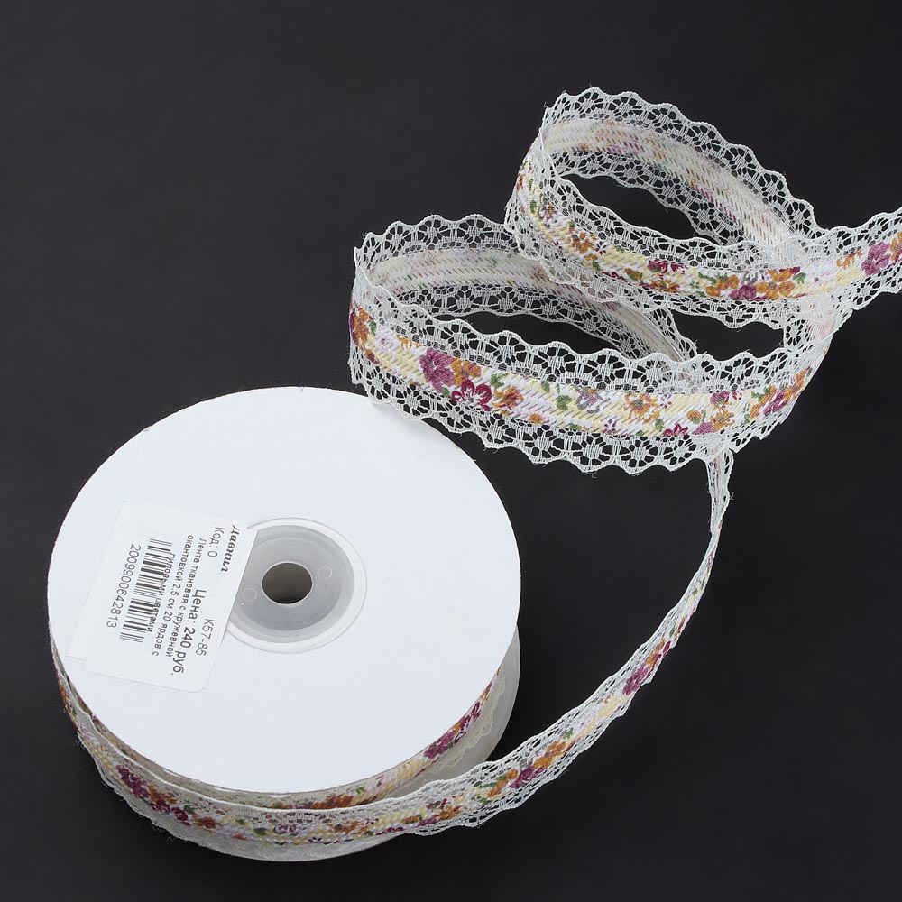 Лента тканевая с кружевной окантовкой 2,5 см 20 ярдов с лиловыми цветами