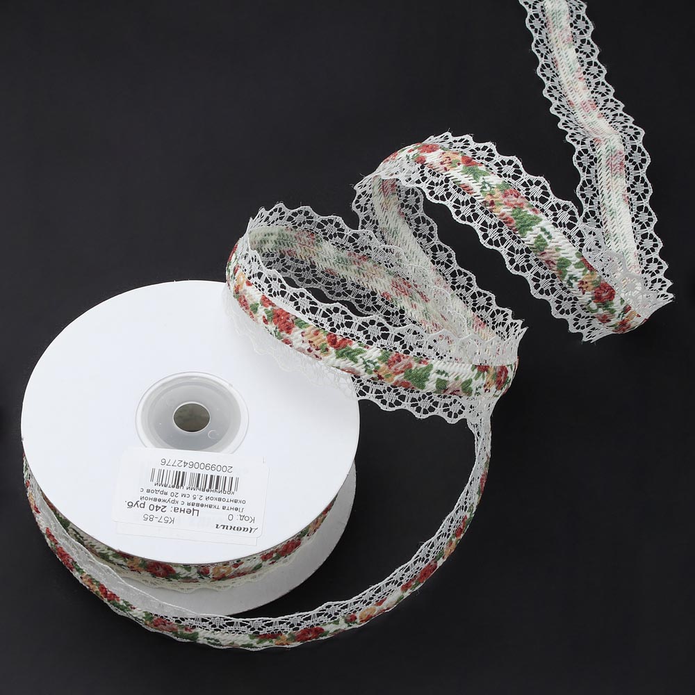 Лента тканевая с кружевной окантовкой 2,5 см 20 ярдов с красными цветами