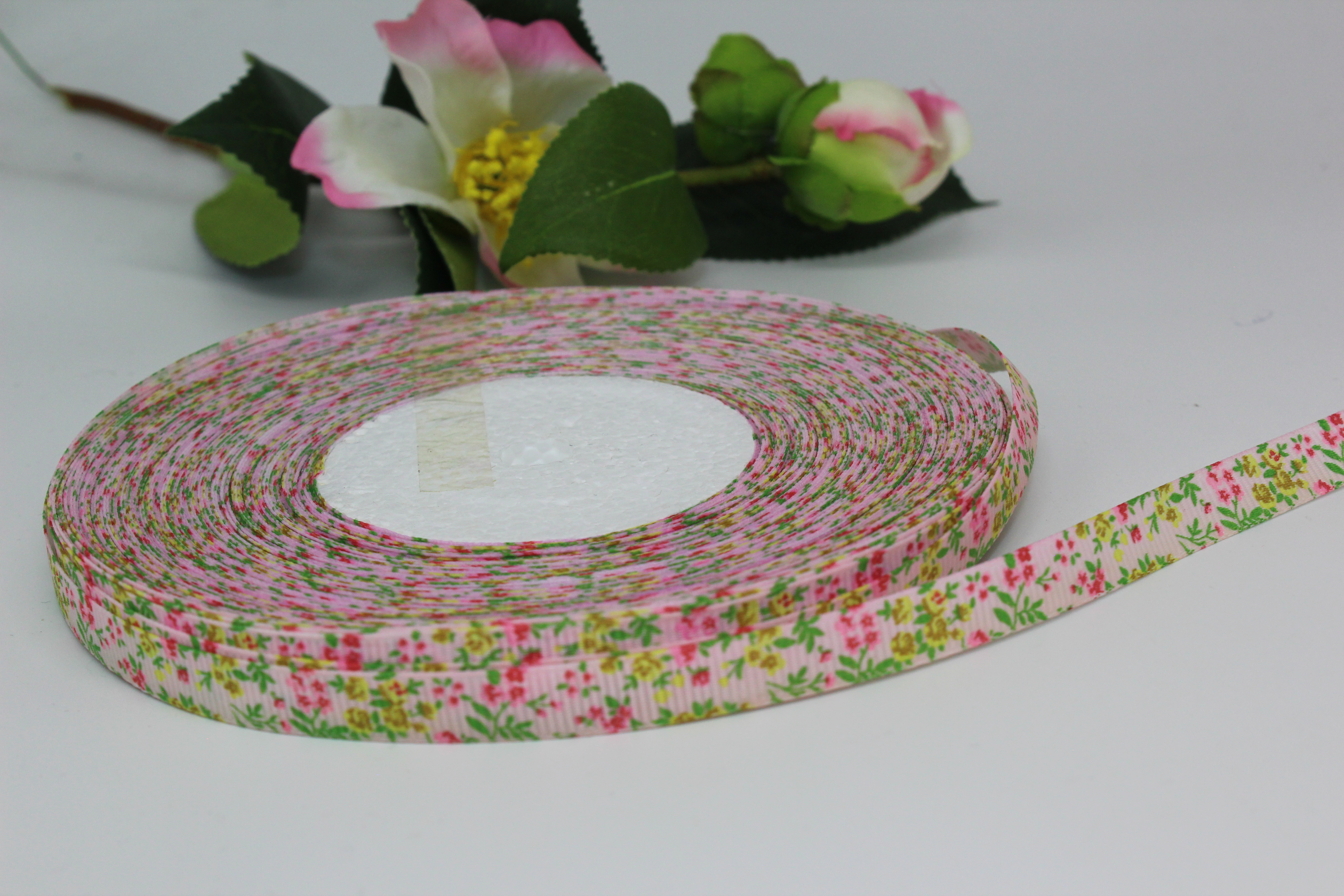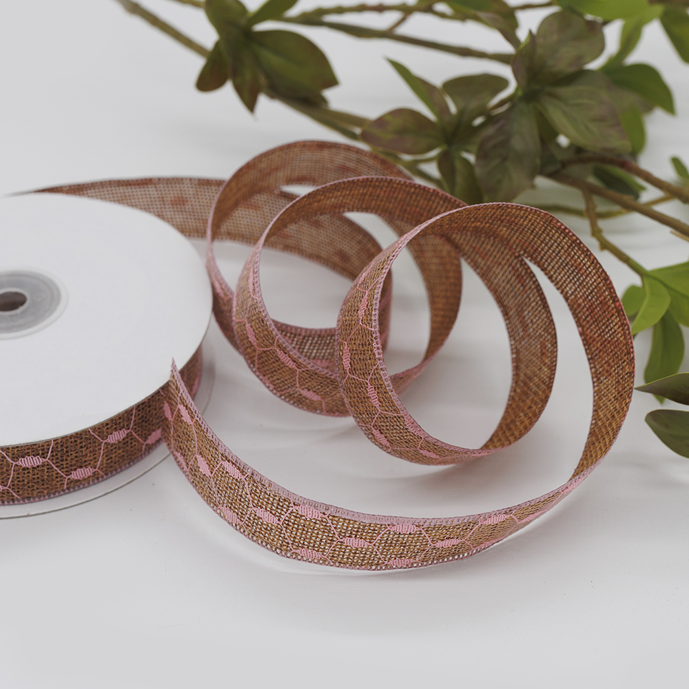 Лента лён с цветочным орнаментом 4 см*20 ярдов, бежевая с розовыми цветами