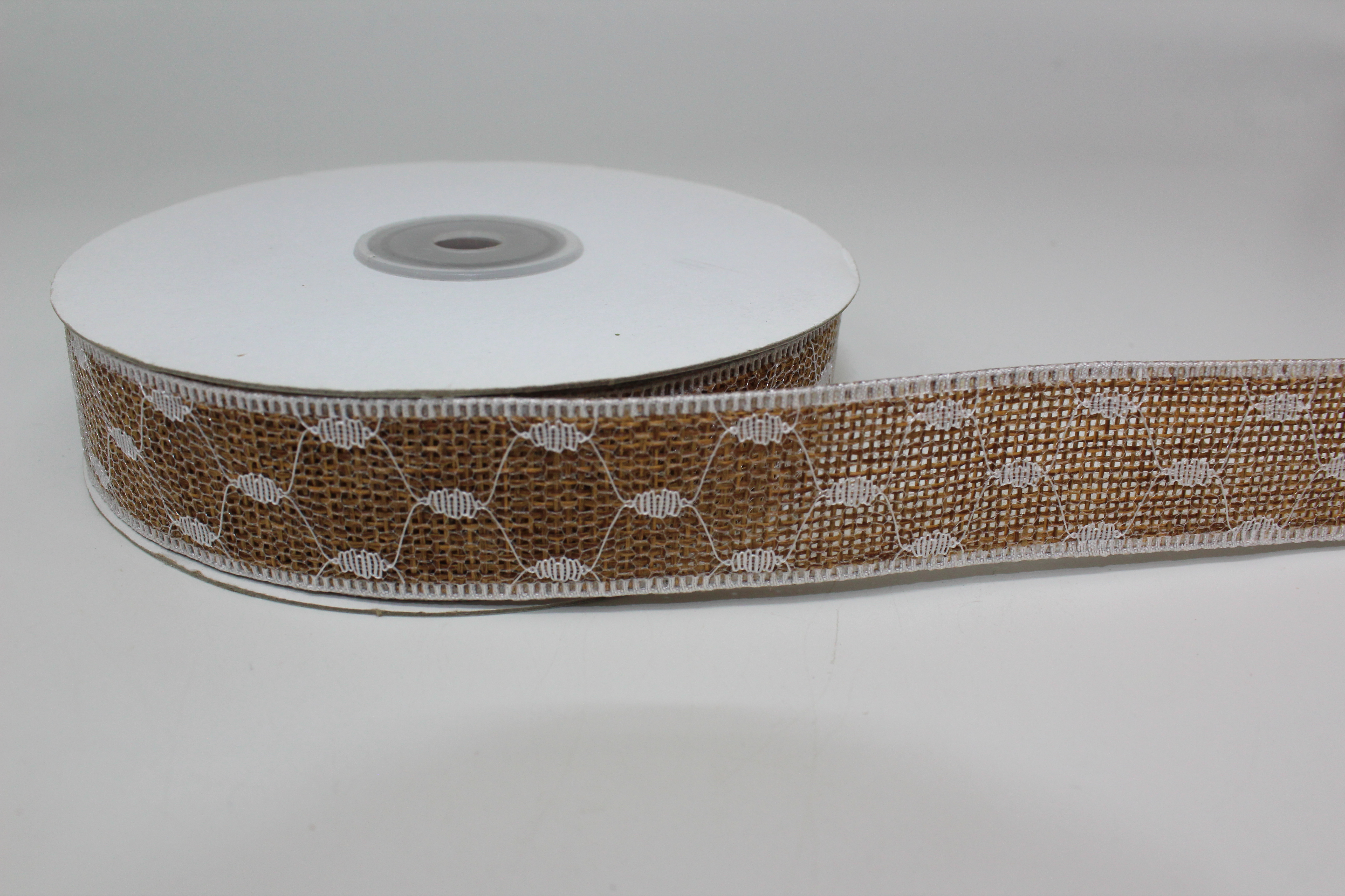 Лента лён с цветочным орнаментом 4 см*20 ярдов, бежевая с коричневыми цветами