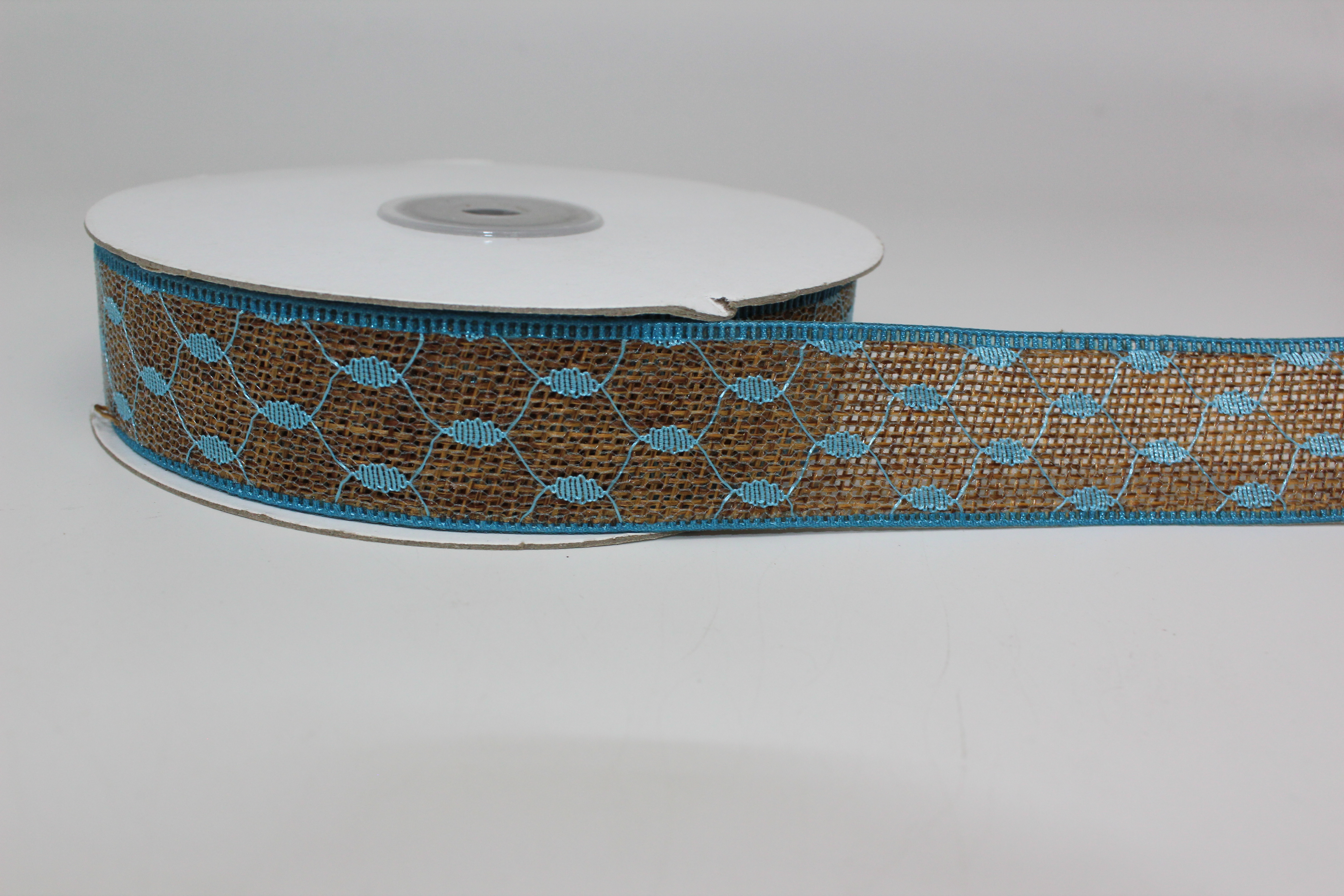 Лента лён с цветочным орнаментом 4 см*20 ярдов, бежевая с голубыми цветами