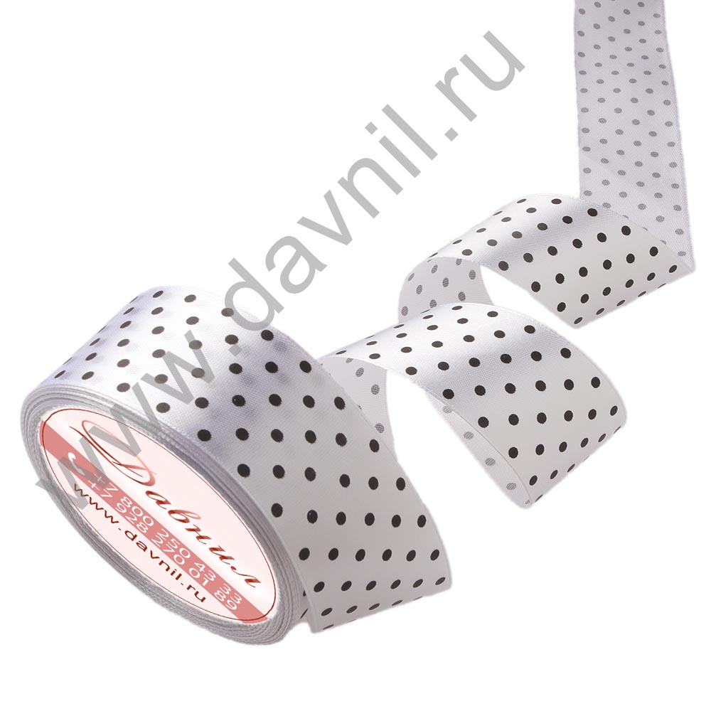 Лента атласная средний горошек 4 см 25 ярдов белая с чёрным 001