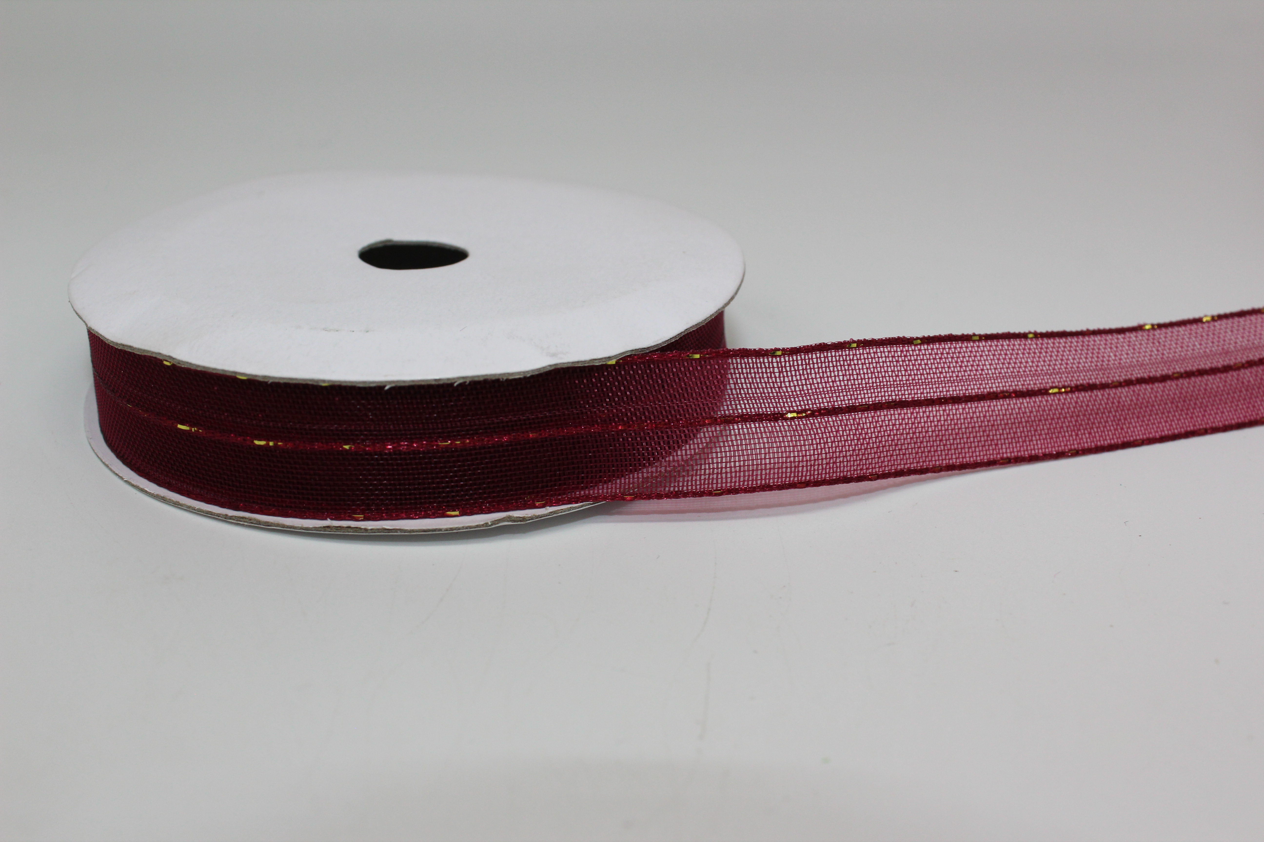 Лента органза 1,5 см 5 ярдов с полоской бордовая