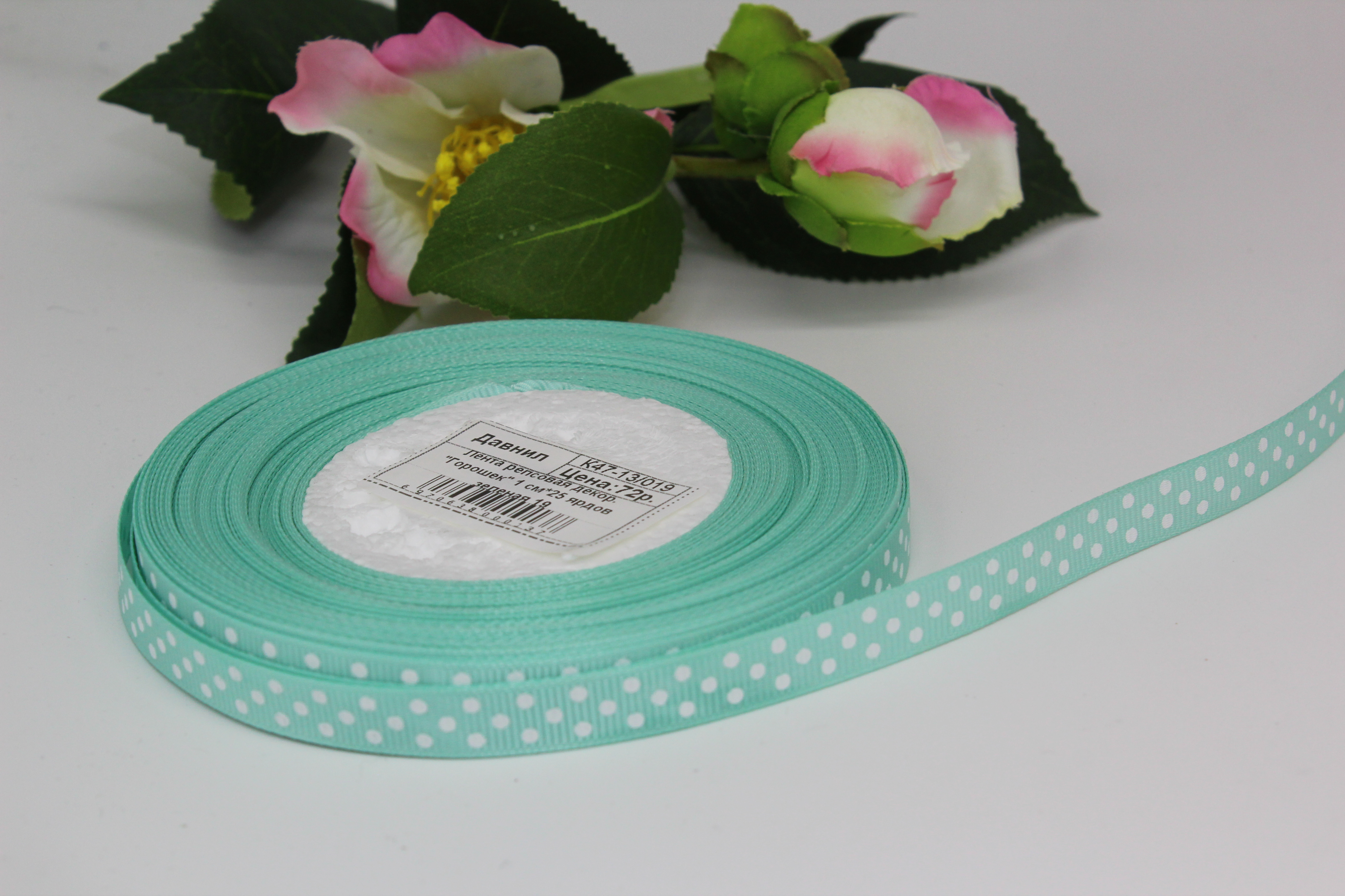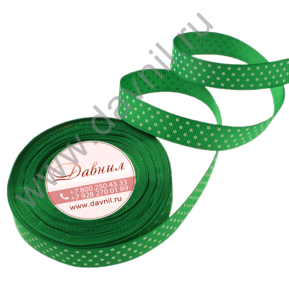 Лента репсовая мелкий горошек 2 см 25 ярдов зеленая 19
