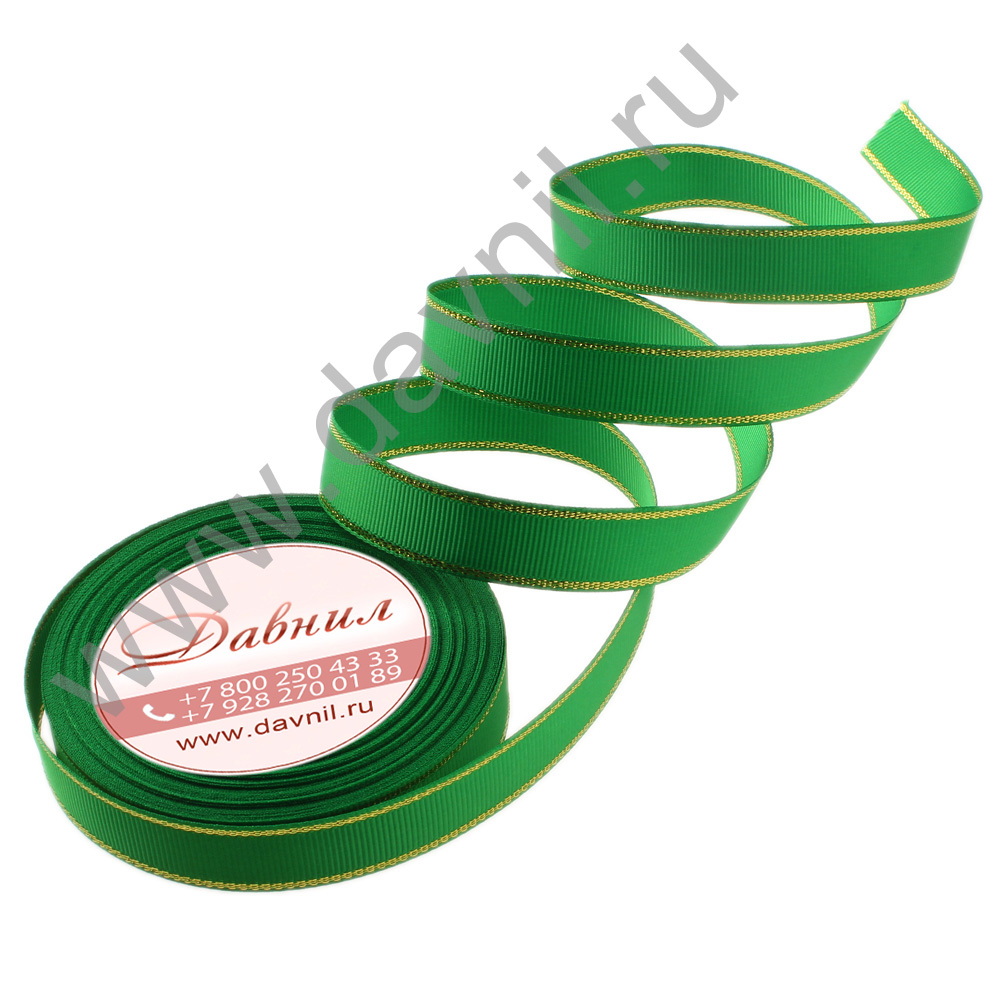 Лента репсовая с золотым люрексом 1 см*20 ярдов зеленая 019
