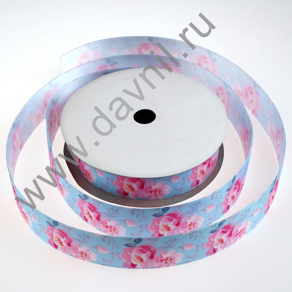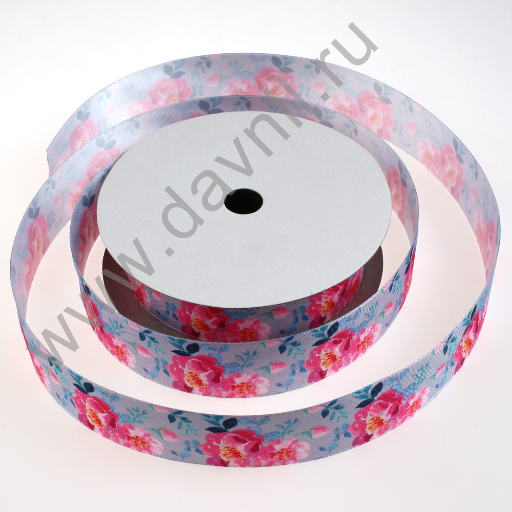 Лента атласная декорированная 2,5 см 10 ярдов "Пионы и мак" голубая