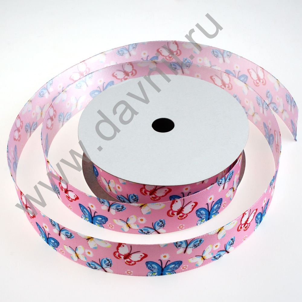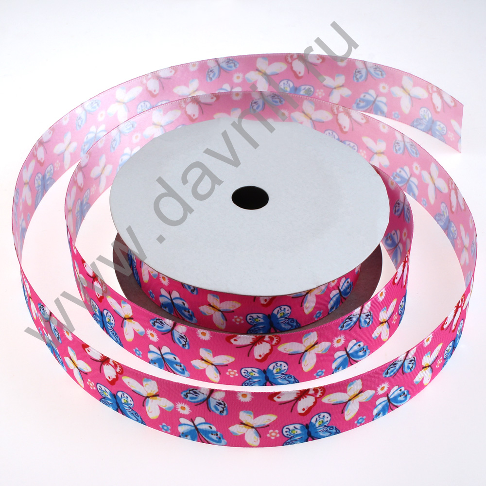 Лента атласная декоративная "Бабочки" 2,5 см*15 ярдов, розовая