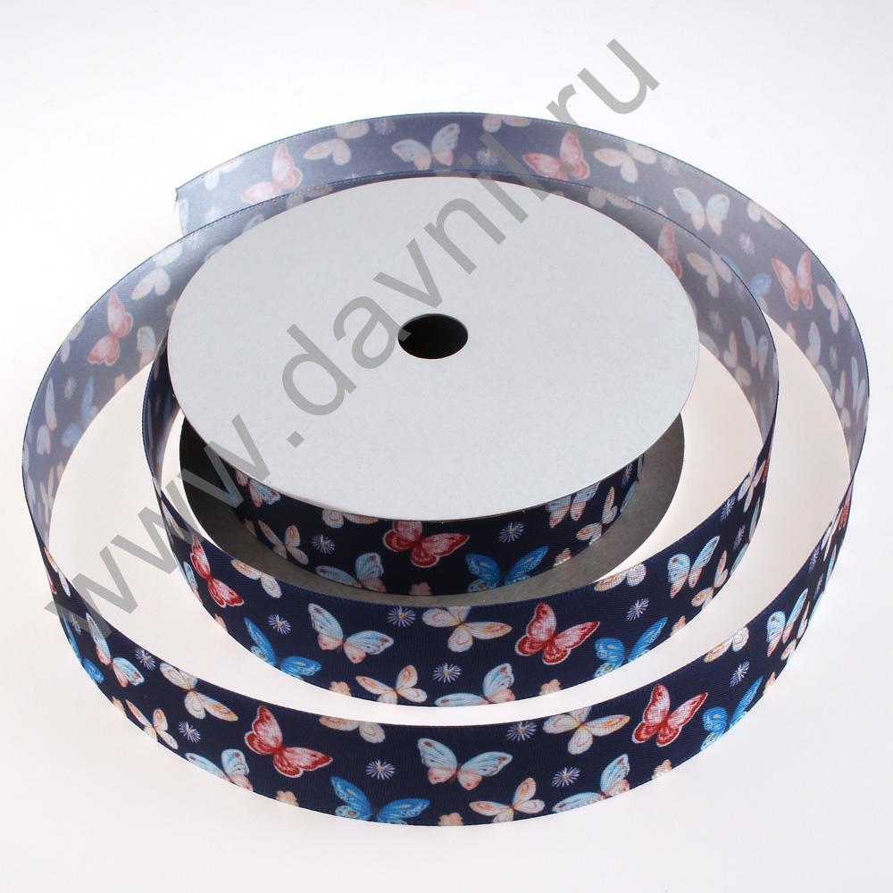 Лента атласная декоративная "Бабочки" 2,5 см*15 ярдов, синяя
