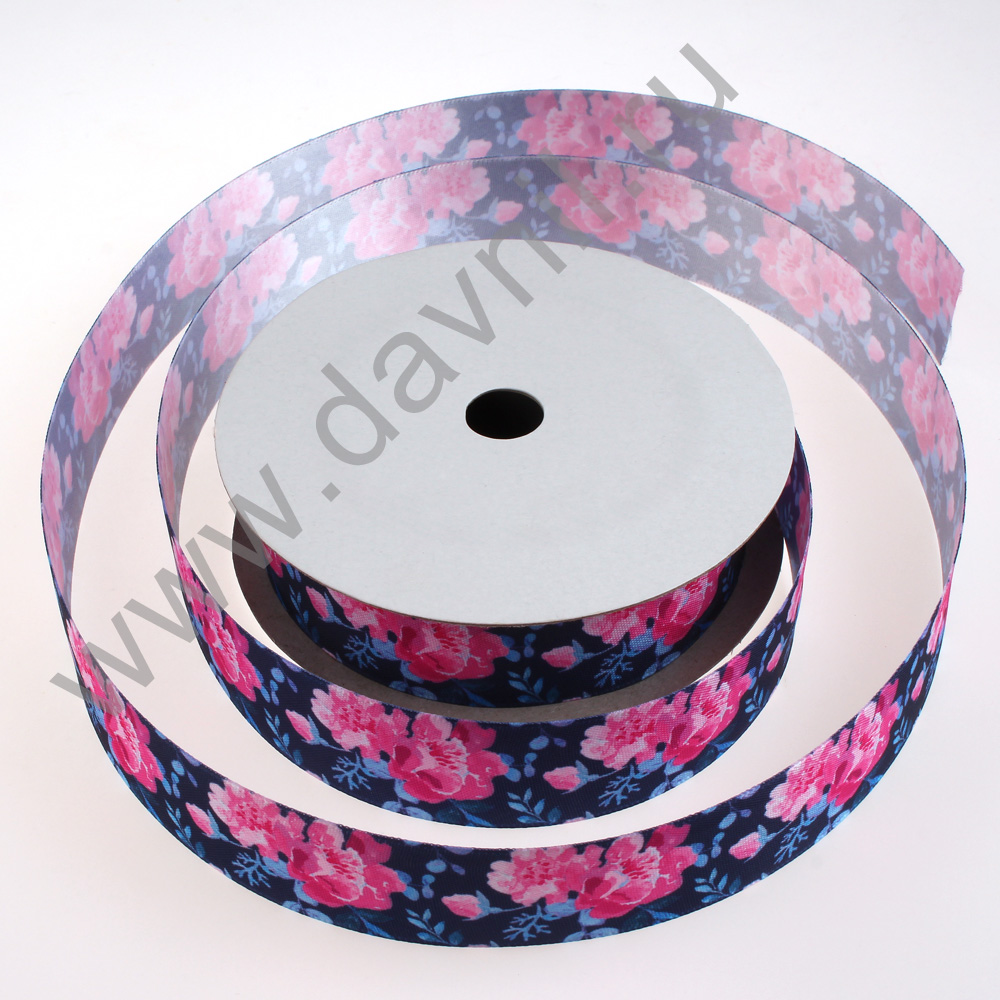 Лента атласная декорированная 2,5 см 10 ярдов "Пионы и мак" синяя