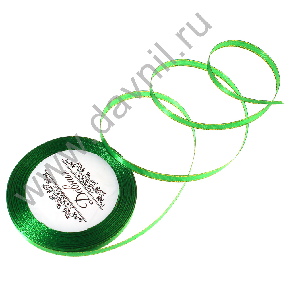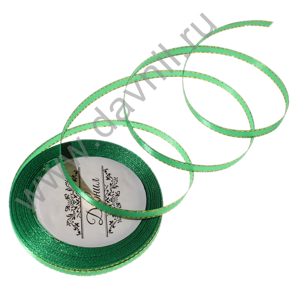 Лента атласная с золотым люрексом 0,6 см*20 ярдов зелёная 019