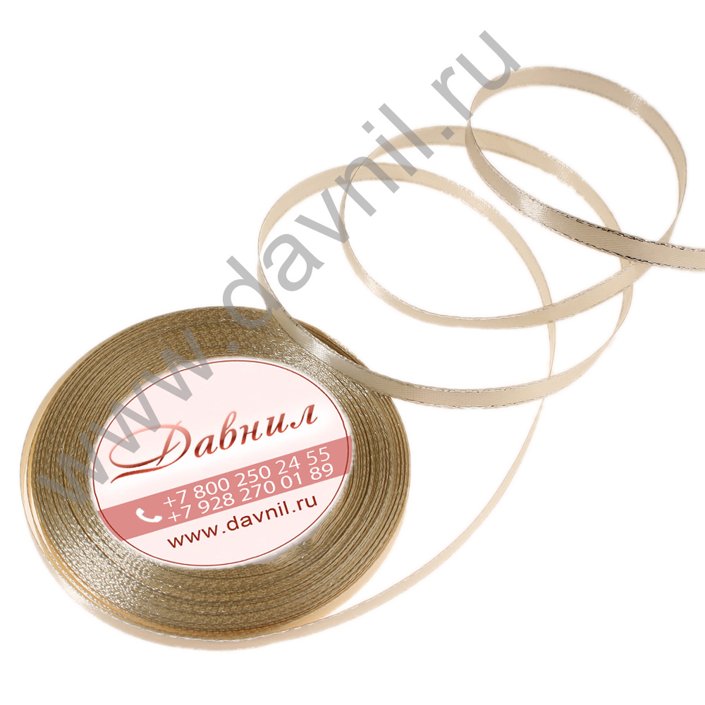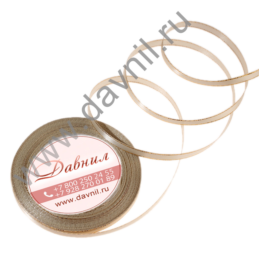 Лента атласная с золотым люрексом 0,6 см*20 ярдов бежевая 002