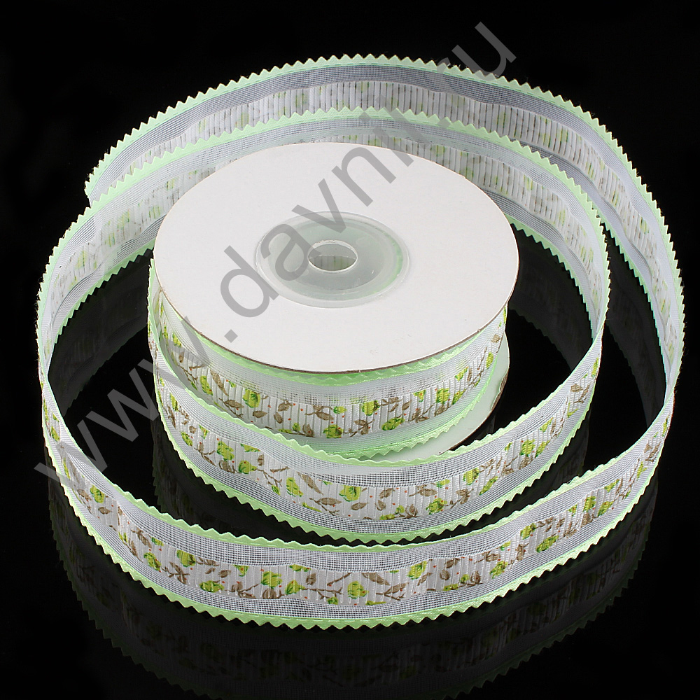 Лента тюль с шелковой кромкой "Полоса с цветами" 2,5 см*15 ярдов салатовая