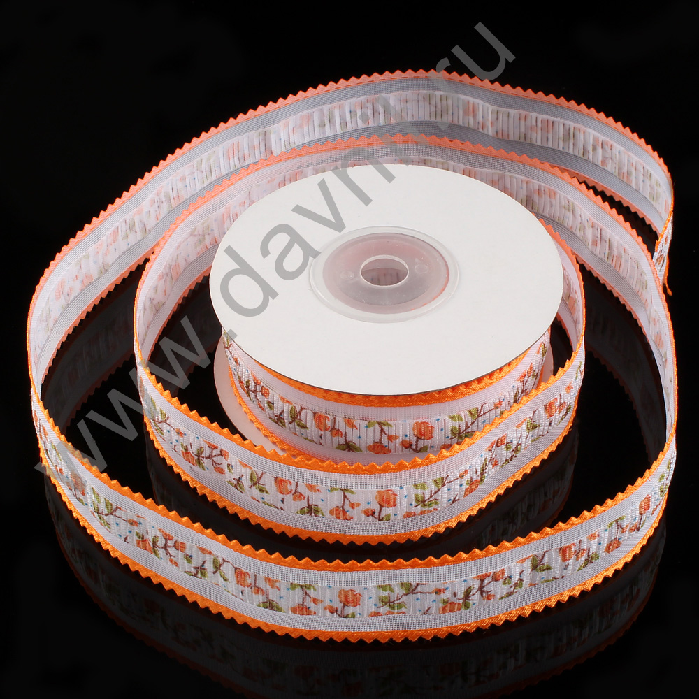 Лента тюль с шелковой кромкой "Полоса с цветами" 2,5 см*15 ярдов оранжевая
