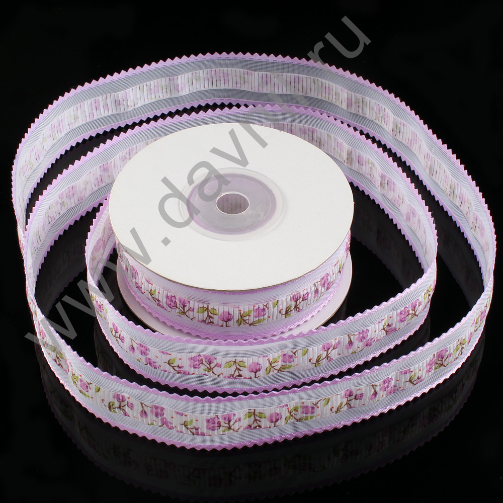Лента тюль с шелковой кромкой "Полоса с цветами" 2,5 см*15 ярдов сиреневая