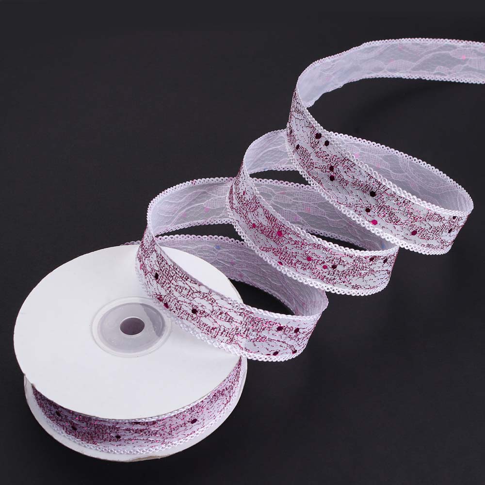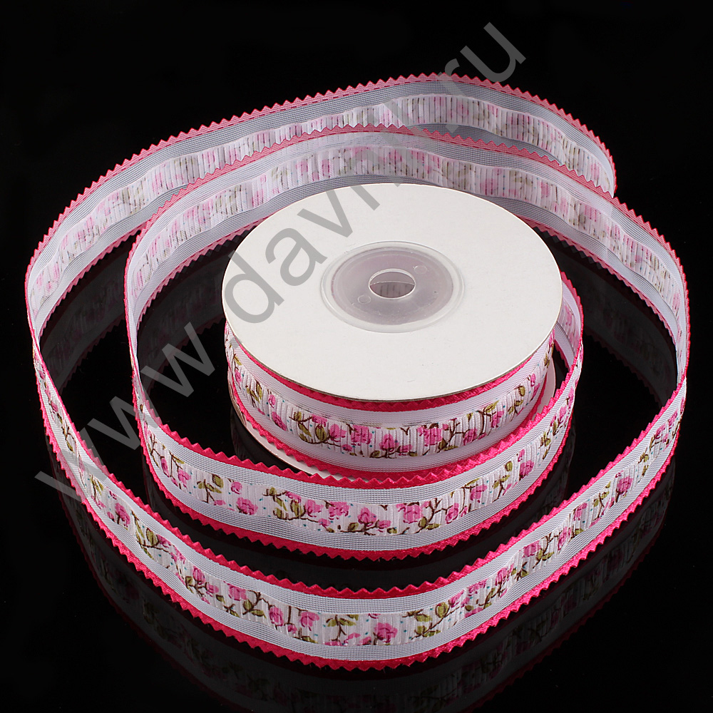Лента тюль с шелковой кромкой "Полоса с цветами" 2,5 см*15 ярдов фуксия