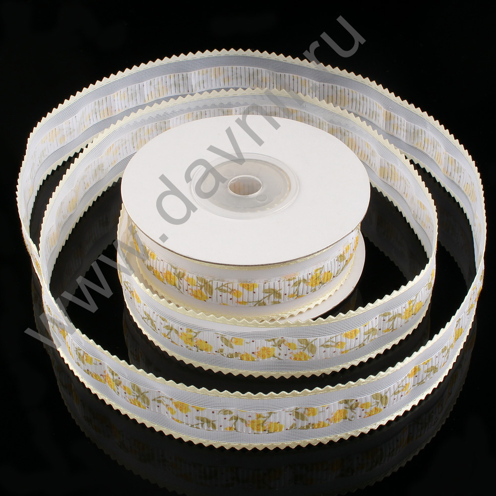 Лента тюль с шелковой кромкой "Полоса с цветами" 2,5 см*15 ярдов жёлтая