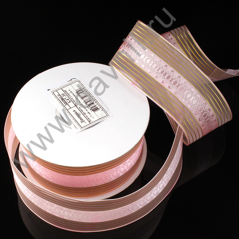 Лента органза "Полоса узорная" с 5-ой золотой оконтовкой 4 см*25 ярд., розовая