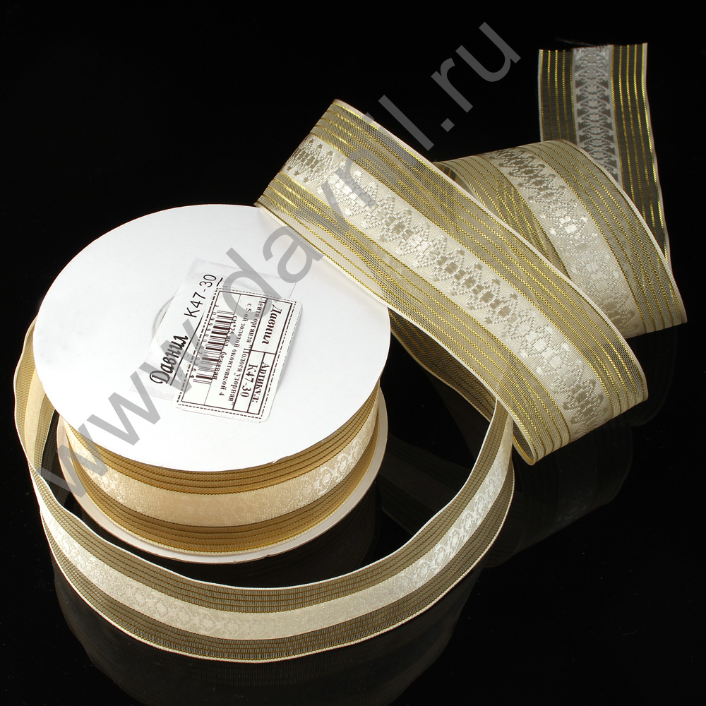 Лента органза "Полоса узорная" с 5-ой золотой оконтовкой 4 см*25 ярд., бежевая