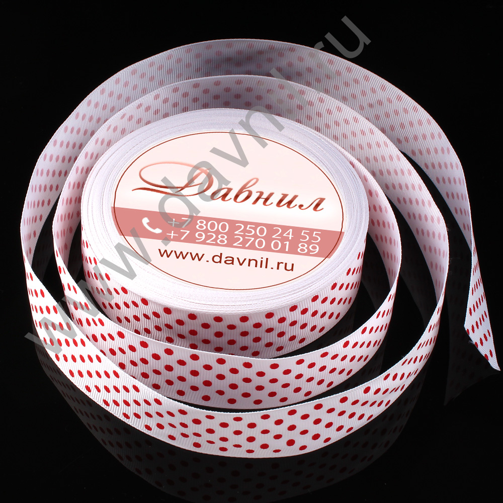 Лента репсовая мелкий красный горошек 2,5 см 25 ярдов, белая 001