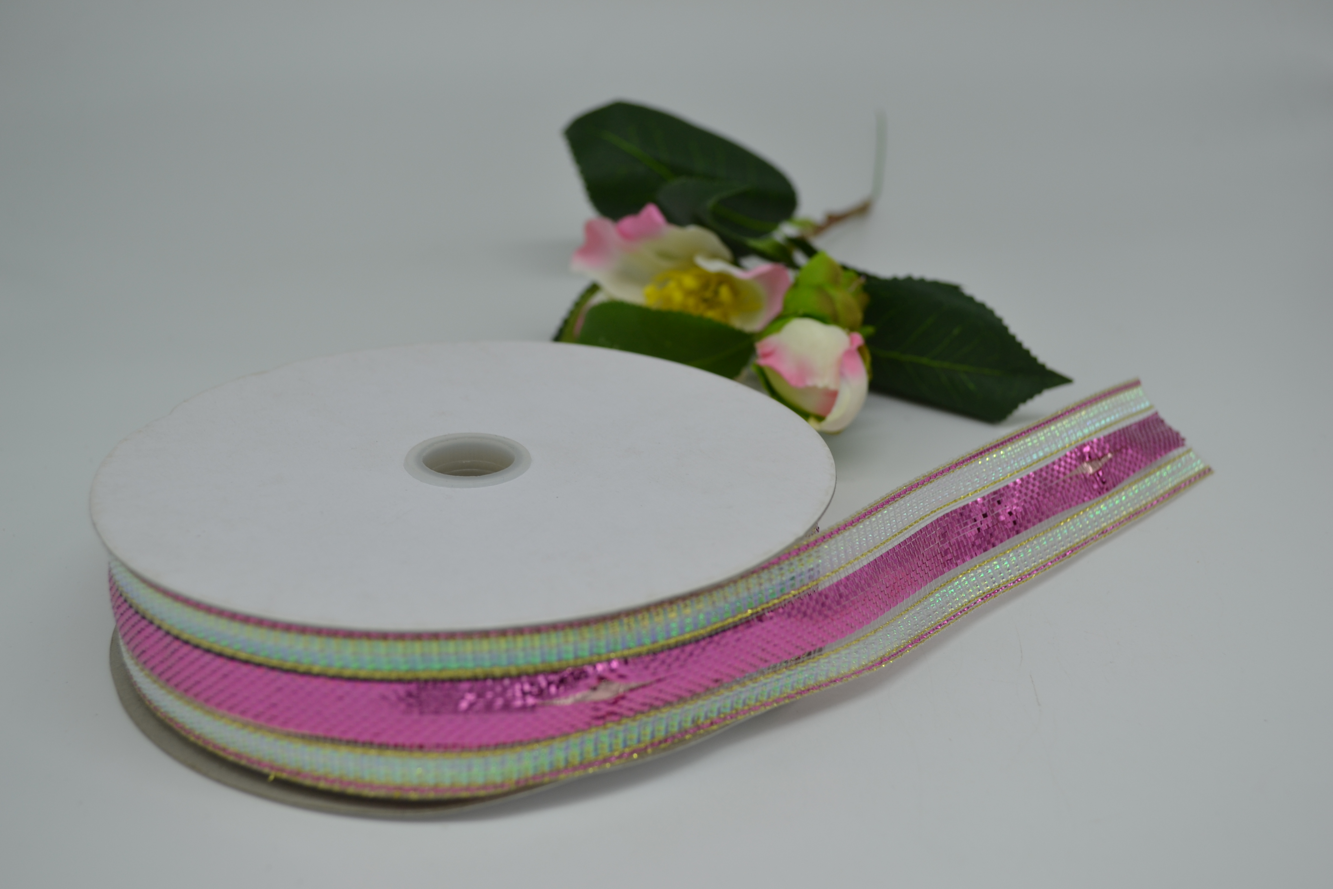Лента сетка 2,5 см 50 ярдов розовая с окантовкой из люрекса