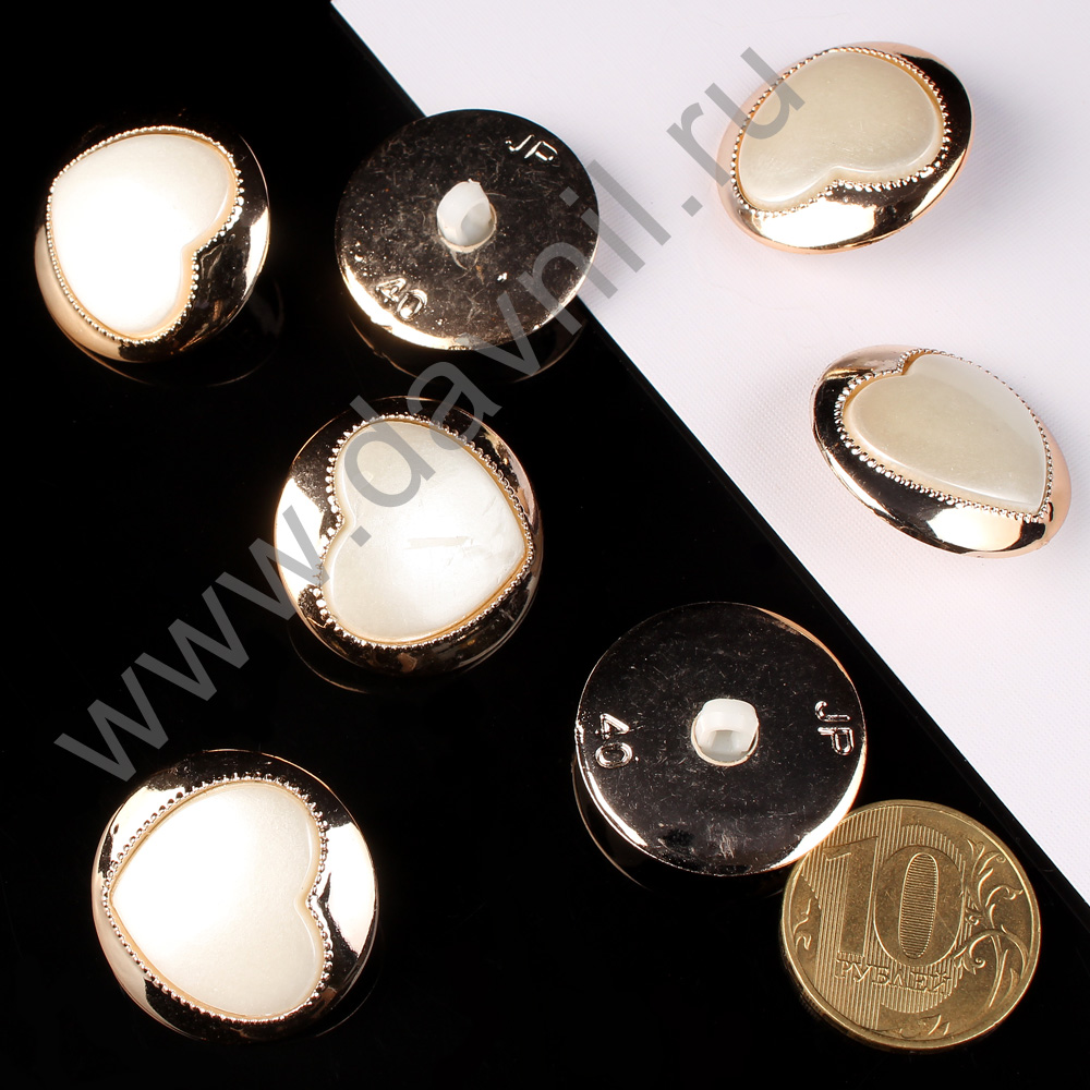 Пуговица 25 мм на ножке сердечко жемчуг в золотой оправе 10 шт