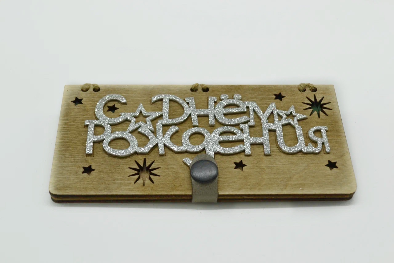 Конверт деревянный " С днём рождения ! " серебряный глитер